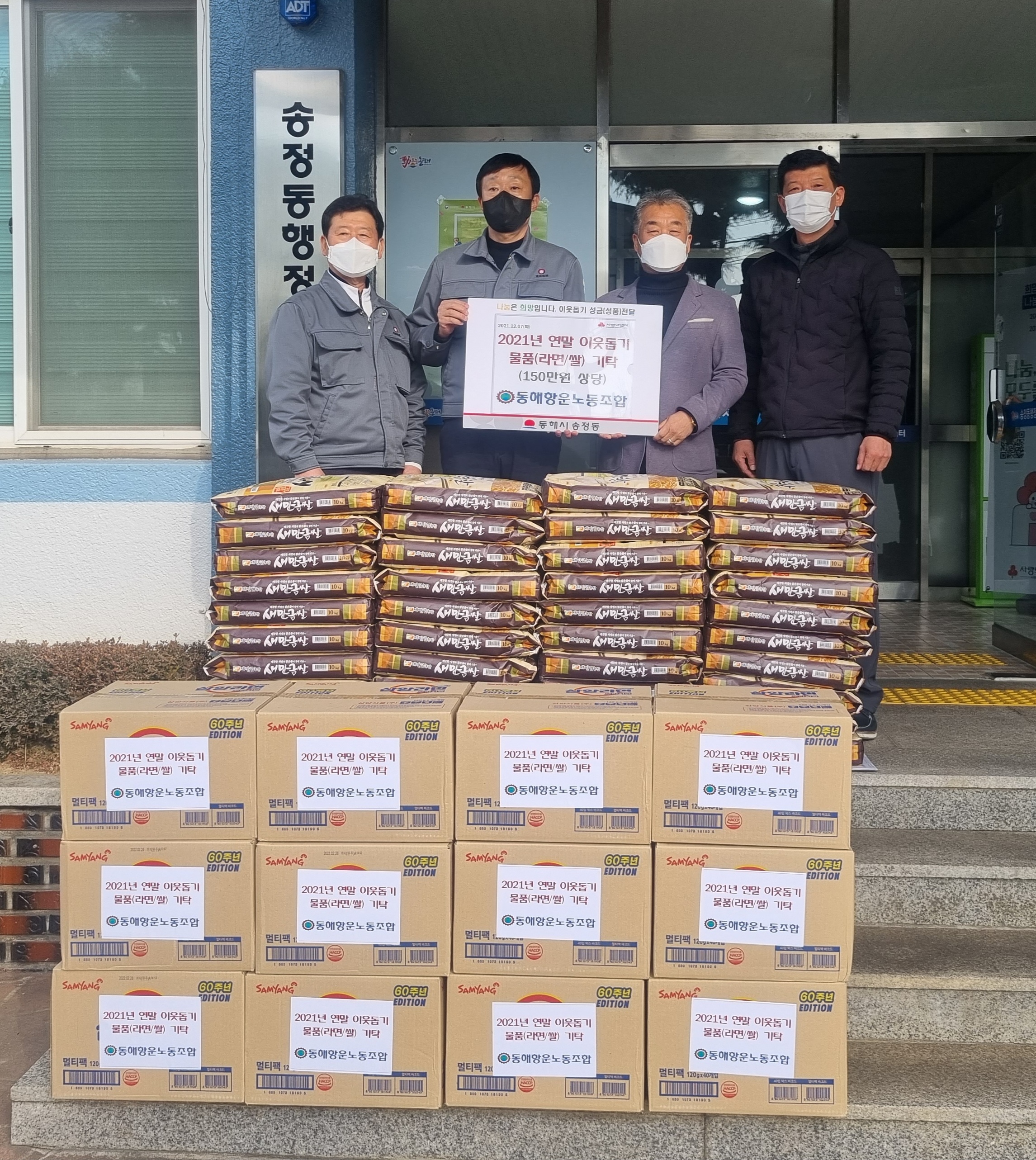 [강원사회복지신문 김종한 기자]=동해항운노동조합(위원장 최순혁)에서는 지난 12월 6일 동해시 송정동행정복지센터를 찾아 송정동의 저소득 가구를 위해 백미 40포, 라면 20박스 등 이웃돕기 물품을 기탁했다.