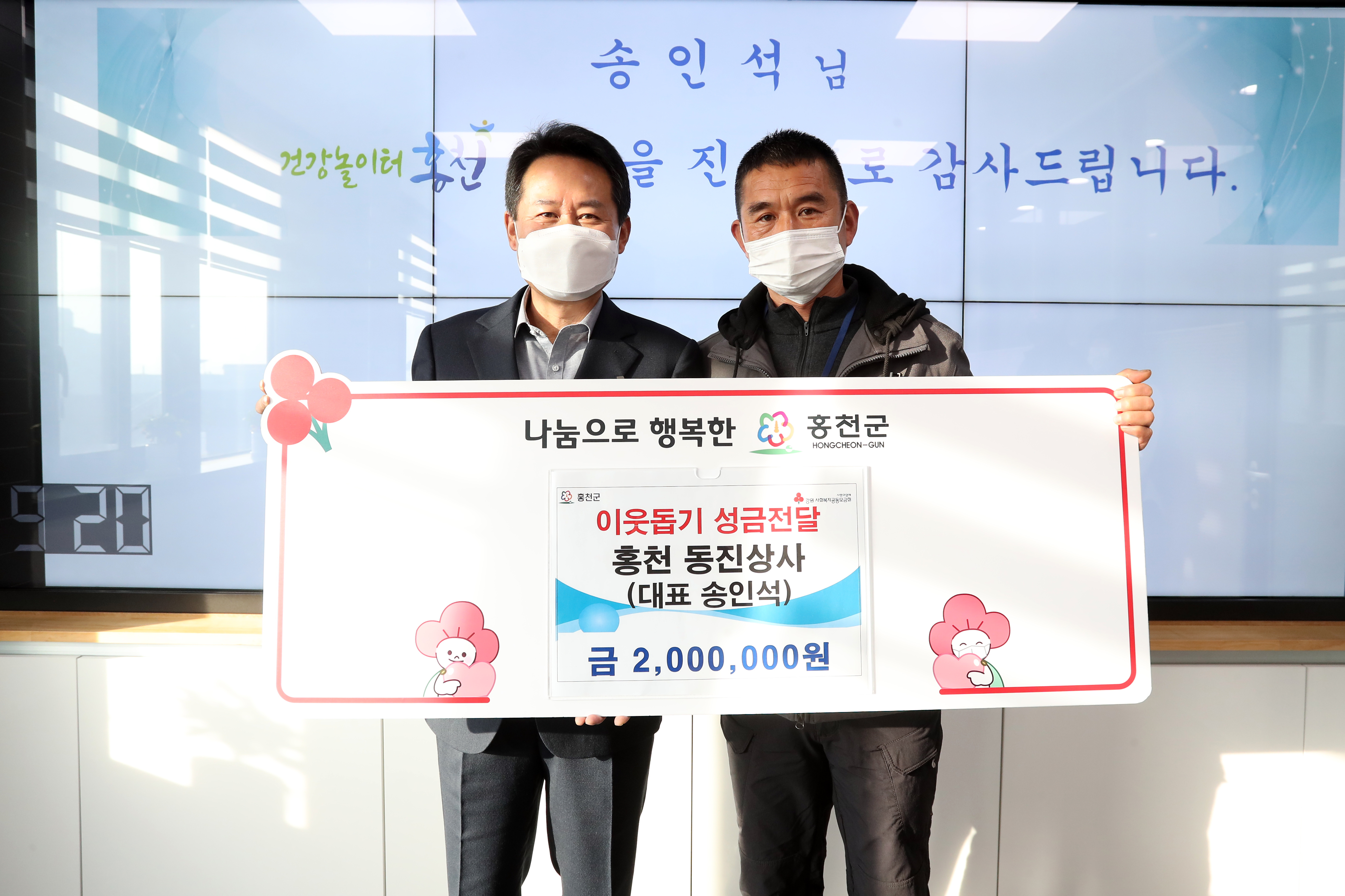[강원사회복지신문 홍기한 기자]=송인석 동진상사 대표는 지난 12월 9일 홍천군청을 방문, 저소득층을 위한 성금 200만원을 기탁했다. 송인석 대표는 "어려운 이웃들에게 조금이나마 도움이 되고자 성금을 기탁하게 됐다”며 “힘든 시기를 이겨낼 수 있는 발판이 되었으면 좋겠다"고 말했다.