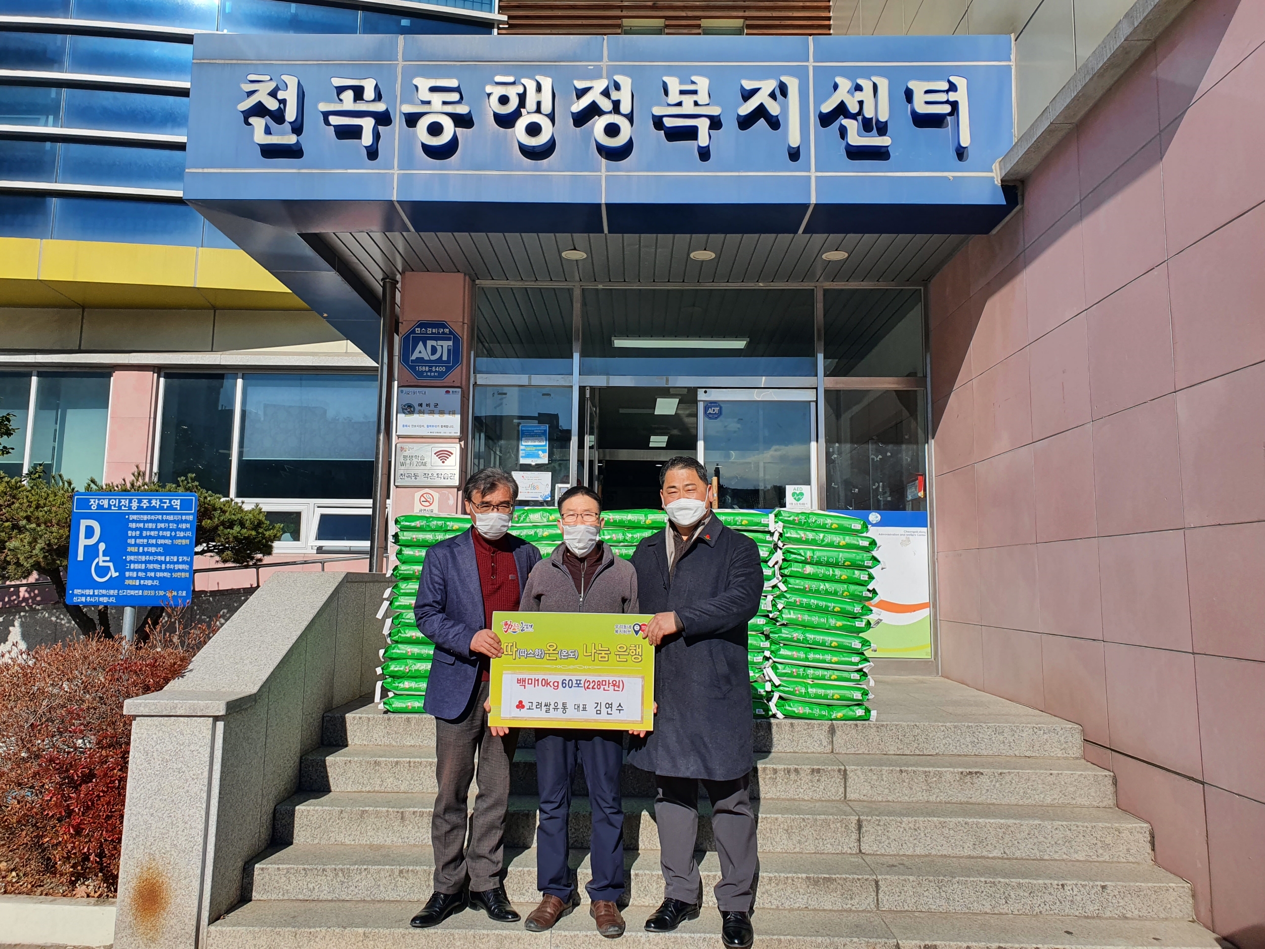 [강원사회복지신문 유경수 기자]=동해시 아너소사이어티 3호 회원인 고려쌀유통 김연수 대표가 동절기 어려운 이웃을 위해 사용해 달라며 강원도공동모금회를 통해 천곡동 지역사회보장협의체에 현금 228만원을 기탁했다. 천곡동 지역사회보장협의체에서는 기탁된 성금으로 백미10kg 60포를 구입해 관내 복지사각지대 등 어려...