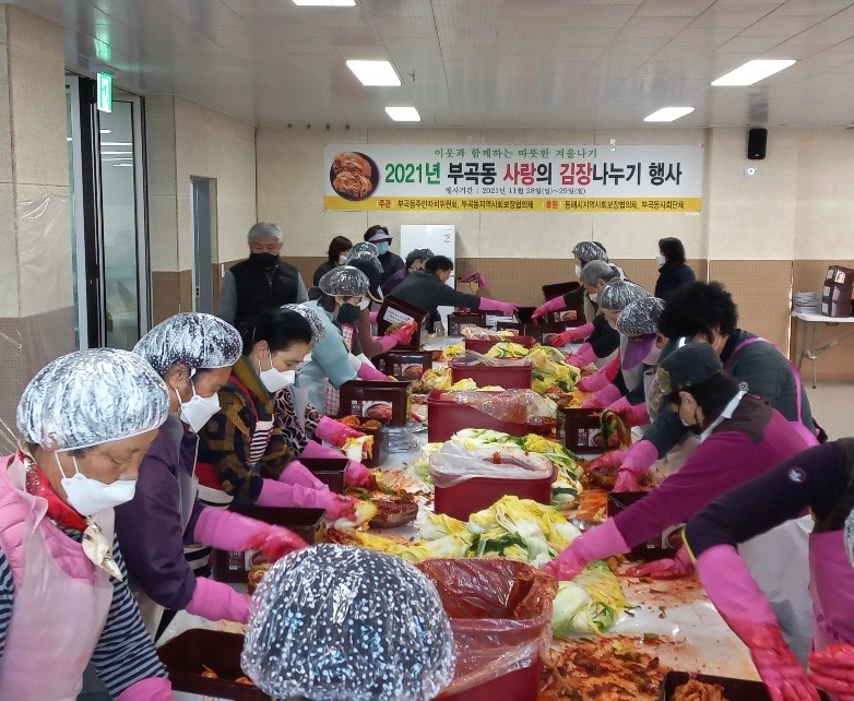[강원사회복지신문 홍기한 기자]=동해시 부곡동행정복지센터(동장 김재희)는 지난 11월 29일 '2021 부곡동 사랑의 김장나누기 행사'를 개최했다고 밝혔다. 이번 김장나누기 행사는 부곡동주민자치위원회와 부곡동지역사회보장협의체 공동 주관으로 지역사회단체, 주민 등 60여명의 자발적인 참여로 진행됐다. 이날 행사에서 ...