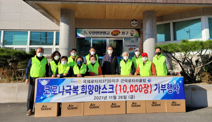 [강원사회복지신문 김종한 기자]=삼척근덕로타리(회장 김영우)에서는 지난 11월 26일 삼척시 근덕면행정복지센터를 방문해 코로나 극복 희망마스크 10,000장을 직접 전달해 이웃들에게 따뜻한 사랑과 나눔을 실천했다.