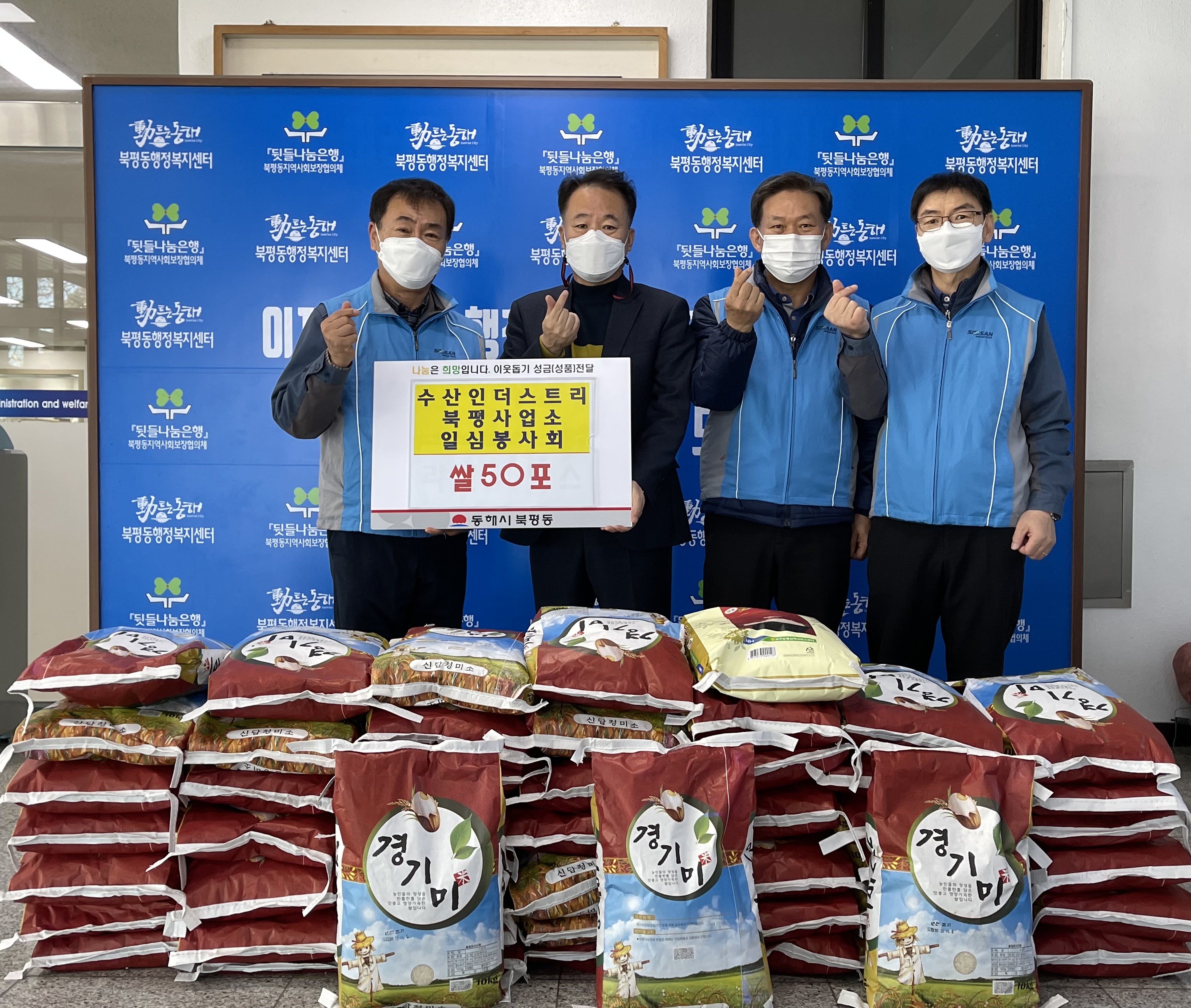 [강원사회복지신문 김종한 기자]=(주)수산인더스트리 북평사업소(소장 나용완) 직원들로 구성된 일심 봉사회(회장 김주열)에서는 지난 11월 25일과 26일 각각 동해시 북평동 행정복지센터와 묵호동 행정복지센터를 방문해 총 350만원 상당의 백미 10kg 100포를 기탁했다. 북평사업소의 사내 봉사단체인 일심봉사회는 지난 20...
