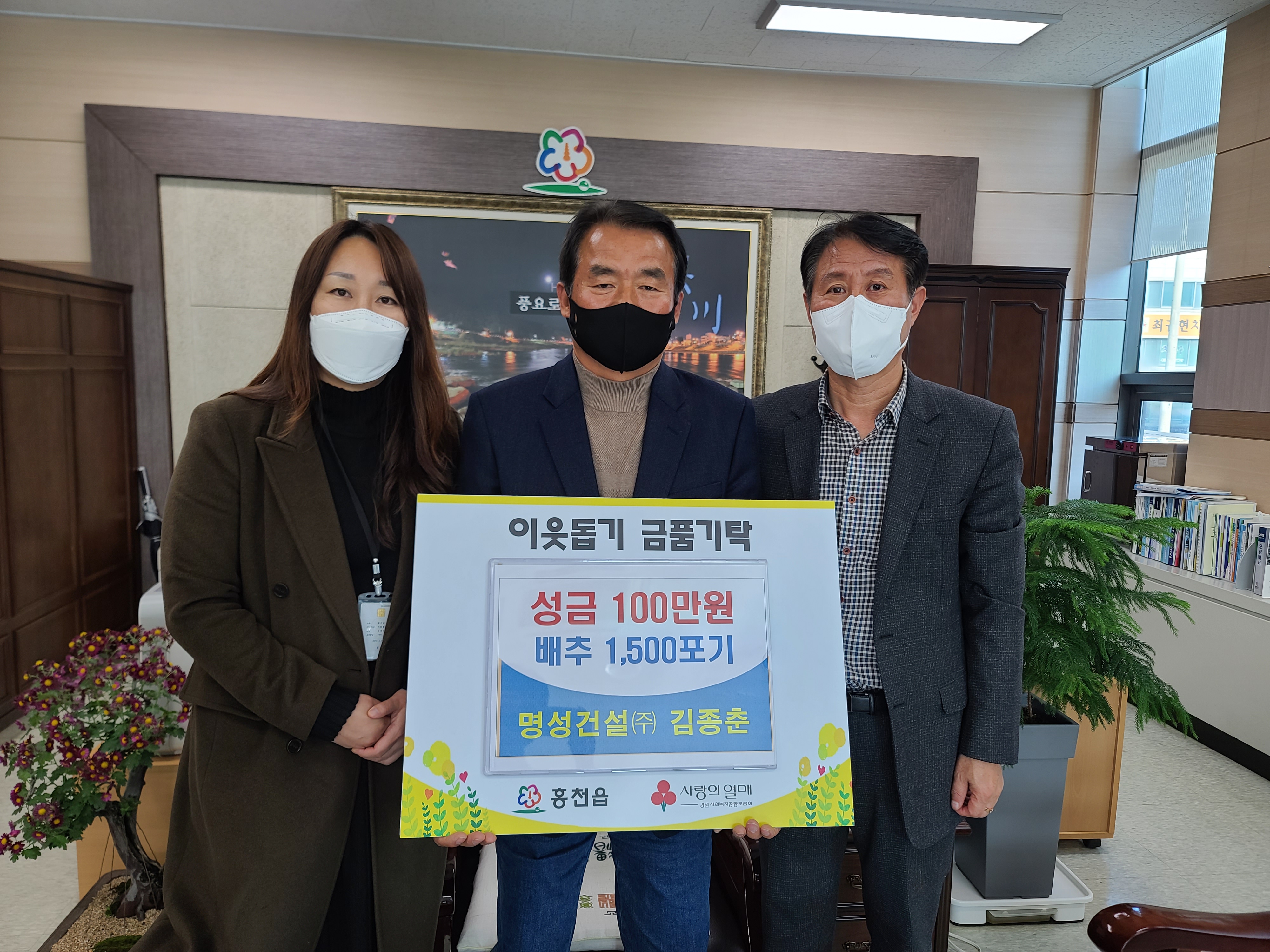 [강원사회복지신문 유경수 기자]=(주)명성건설(대표 김종춘)은 지난 11월 17일 홍천읍 행정복지센터를 방문, 홍천읍에 거주하는 저소득 취약가구를 돕기 위한 성금 100만원과 김장배추 1,500포기를 기탁했다. 전달된 성금은 홍천읍 지역사회보장협의체 사업비로 사용될 예정이며, 물품은 취약계층 가구에 전달될 예정이다. 김...