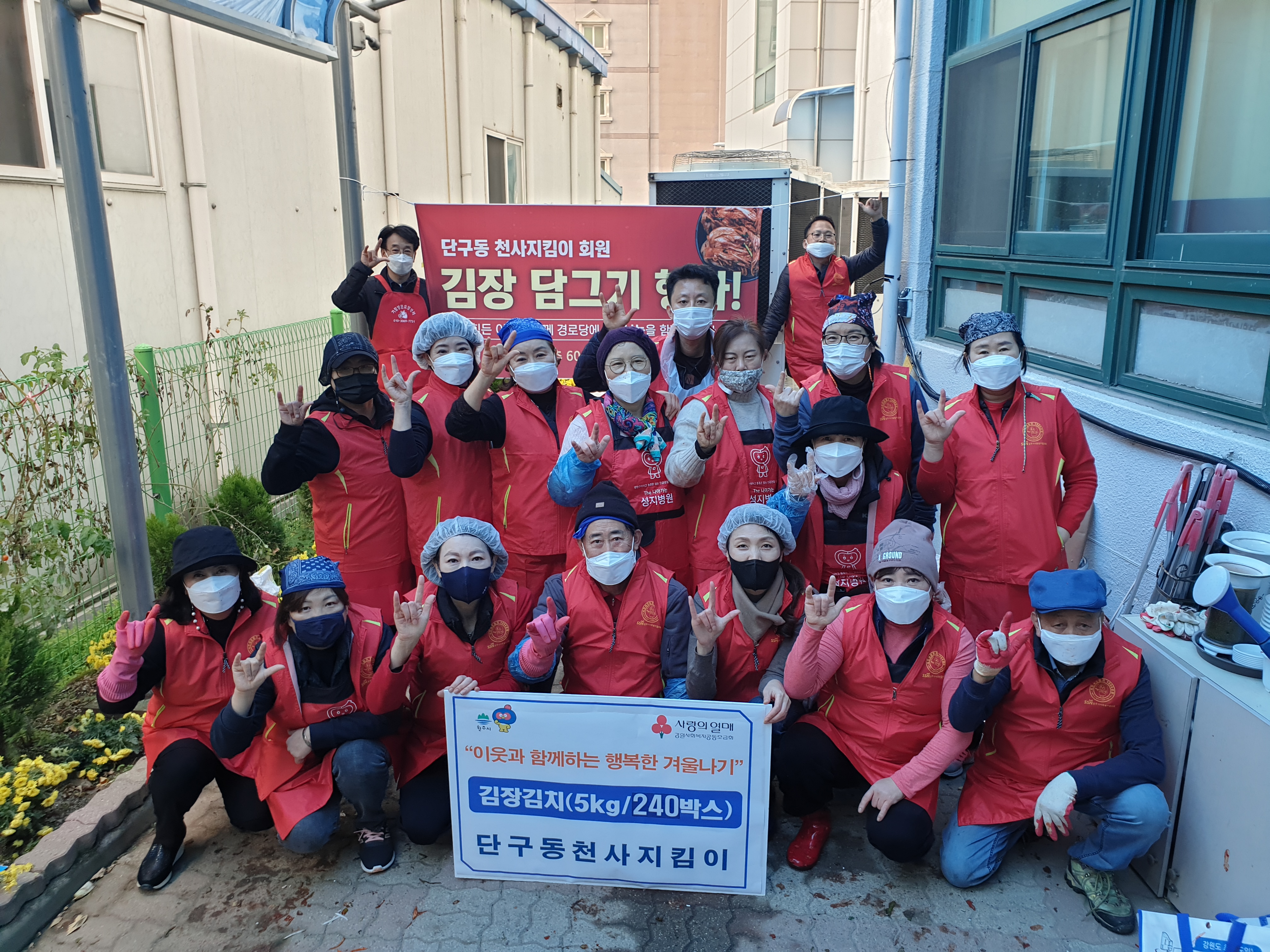 [강원사회복지신문 유경수 기자]=원주시 단구동 천사지킴이(회장 김길선)는 지난 11월 14일 이웃과 함께하는 행복한 겨울나기의 하나로 김장 나눔 행사를 열고 경로당 33곳을 비롯해 독거노인, 장애인 등 취약계층에 김장김치 1,200kg과 라면, 쌀, 생필품 등으로 구성된 선물꾸러미를 전달했다.