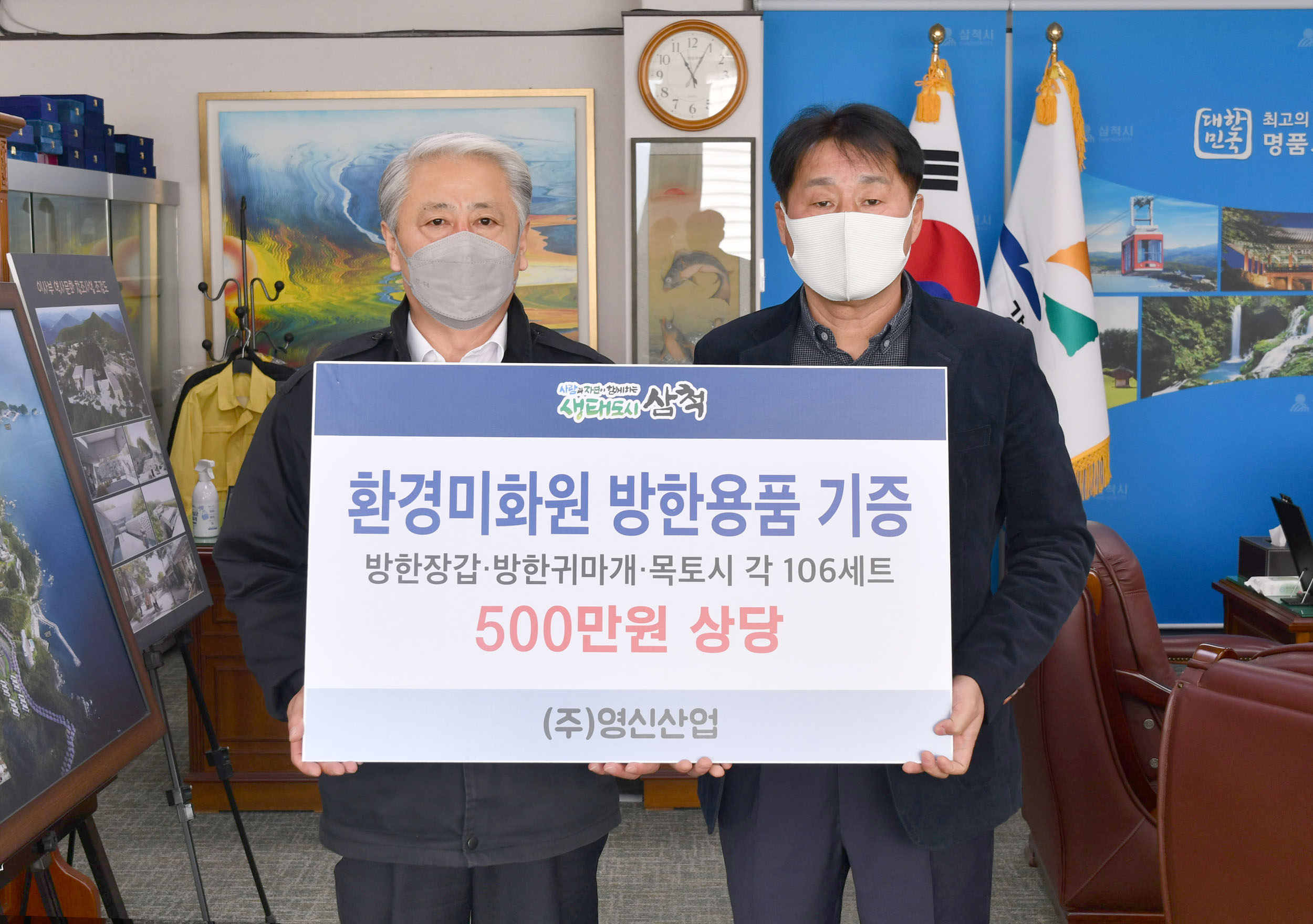 [강원사회복지신문 김종한 기자]=영신산업(대표 김성남)은 지난 11월 16일 삼척시를 방문해 추운 겨울철 깨끗한 도시를 만들기 위해 노고가 많은 환경미화원들을 위한 500만원 상당의 방한용품 106세트를 기탁했다. 이날 기탁된 후원 물품은 보온장갑, 방한귀마개, 워머 등 모두 3종으로 구성된 방한용품 세트로 삼척시 소속...