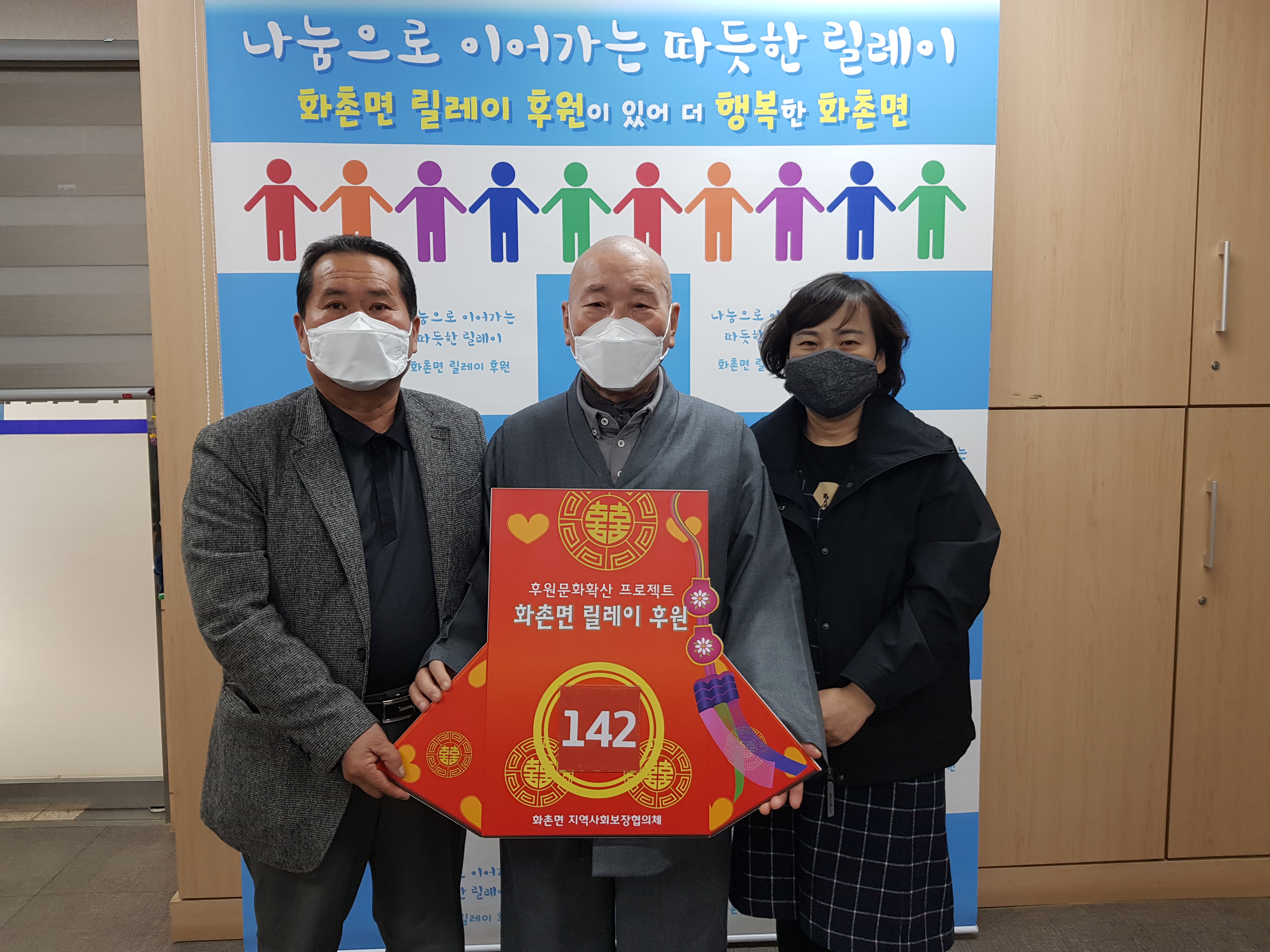 [강원사회복지신문 홍기한 기자]=홍천군 화촌면 광운사 청운 회주스님은 지난 11월 17일 화촌면 행정복지센터를 방문, 자비와 나눔의 삶을 전하며 '화촌면 릴레이 후원'의 142번째 주자로 참여하고 후원금을 기탁했다. 올해만 3번째 화촌면 릴레이 후원에 참여한 청운 회주스님은 총 12번의 후원 이력을 갖게 됐다. 청운 회주...