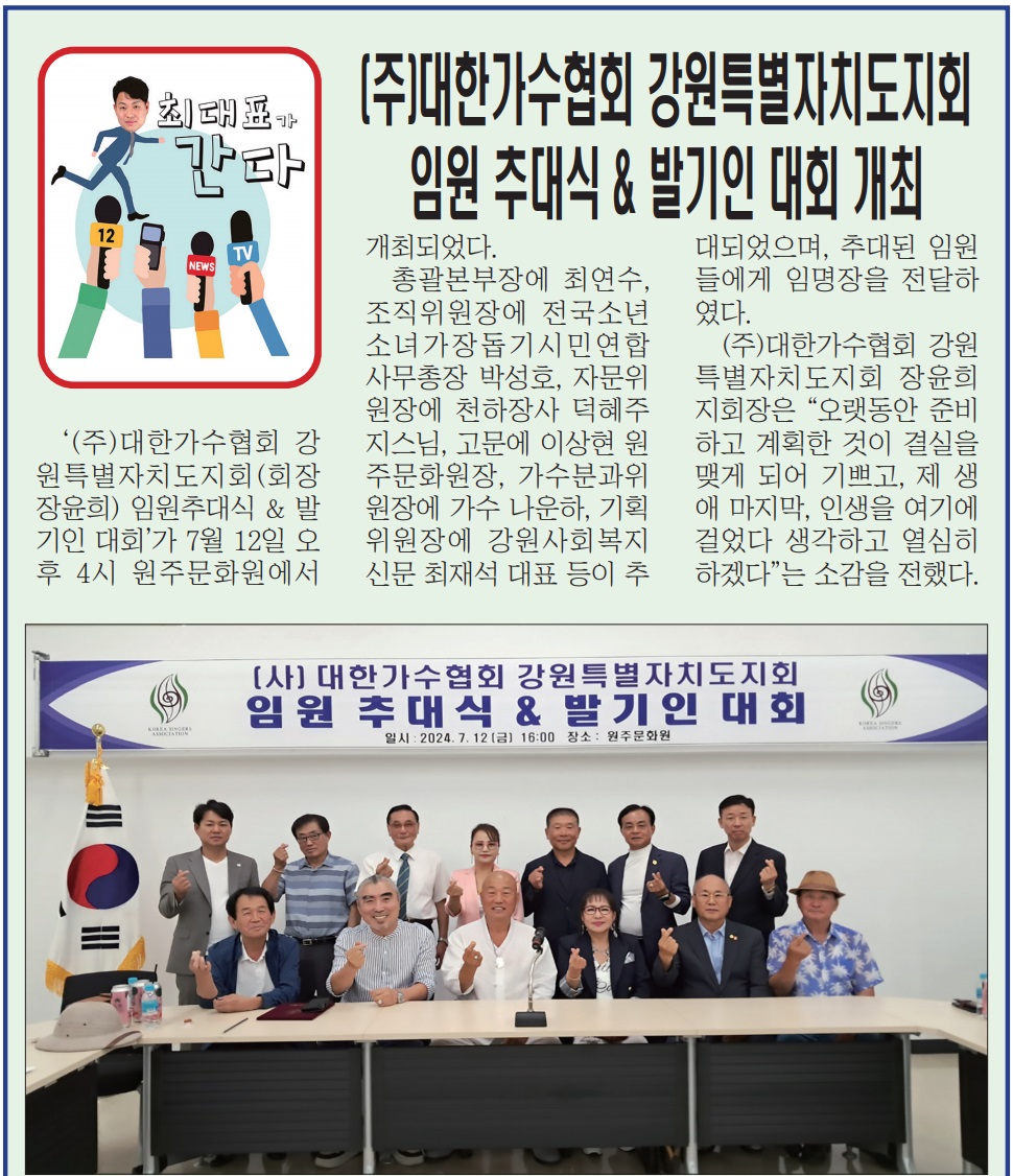 ‘(주)대한가수협회 강원특별자치도지회(회장 장윤희) 임원추대식 & 발기인 대회’가 7월 12일 오후 4시 원주문화원에서 개최되었다. 총괄본부장에 최연수, 조직위원장에 전국소년소녀가장돕기시민연합 사무총장 박성호, 자문위원장에 천하장사 덕혜주지스님, 고문에 이상현 원주문화원장, 가수분과위원장에 가수 나운하...