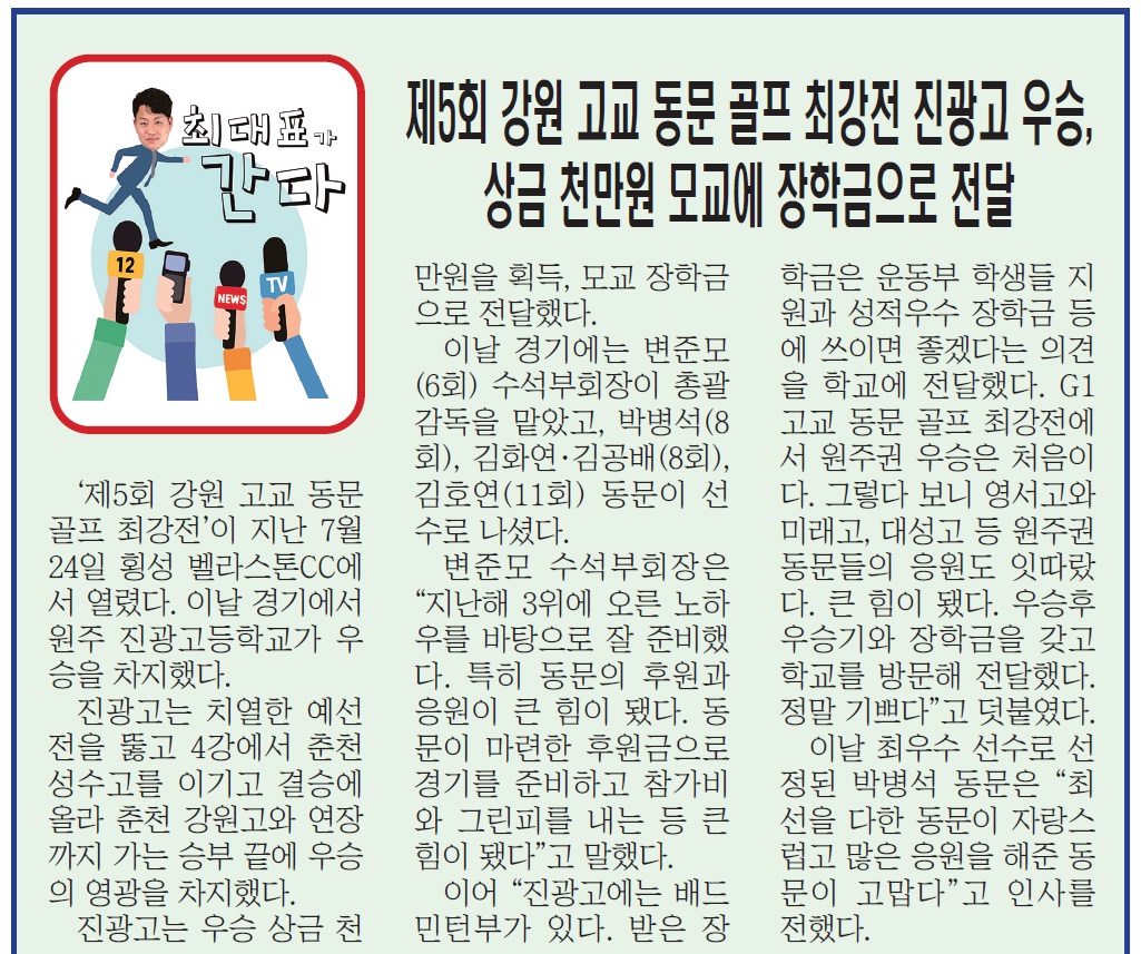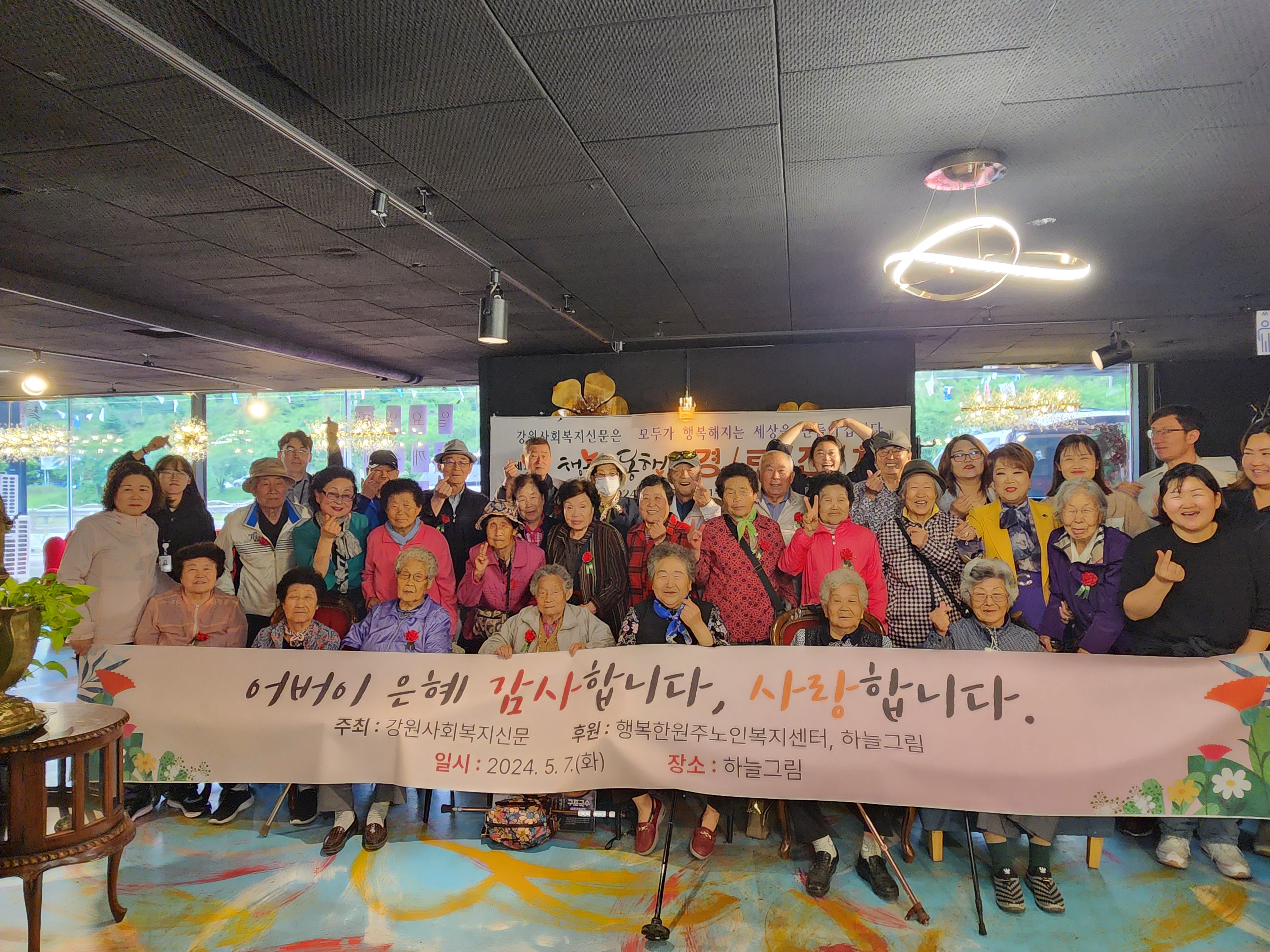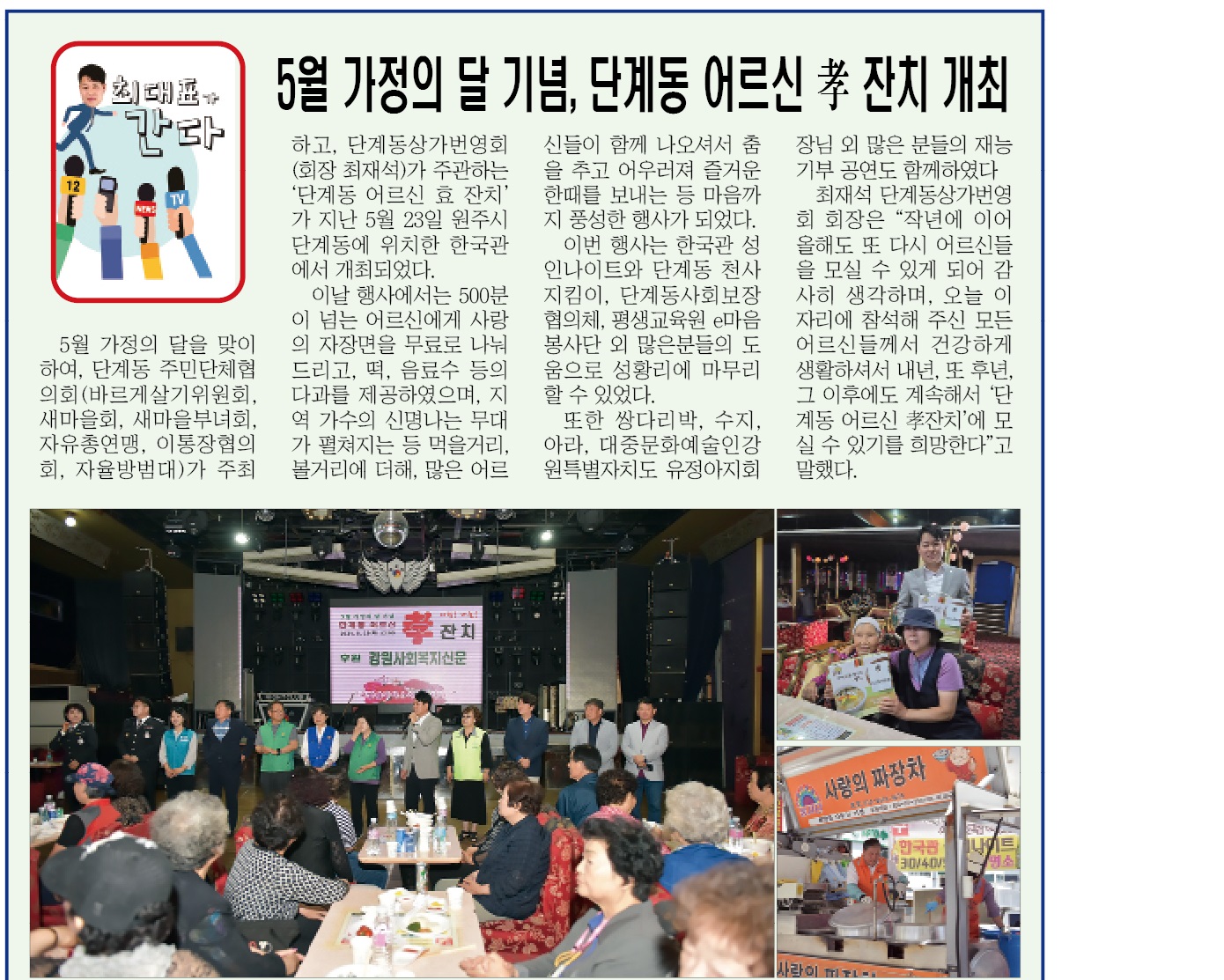 강원사회복지신문(대표 최재석)은 5월 가정의 달을 맞아 지난 5월 7일(화) 하늘그림 카페&뷔페에서 ‘강원사회복지신문은 모두가 행복해지는 세상을 만들어 갑니다’라는 슬로건 아래 ‘제12회 행복한 동행 경로잔치’를 개최하였다. 이날 행사에는 원주시사회복지협의회 박만호 회장, 하늘그림 뷔페 고순임 대표, 강원사...
