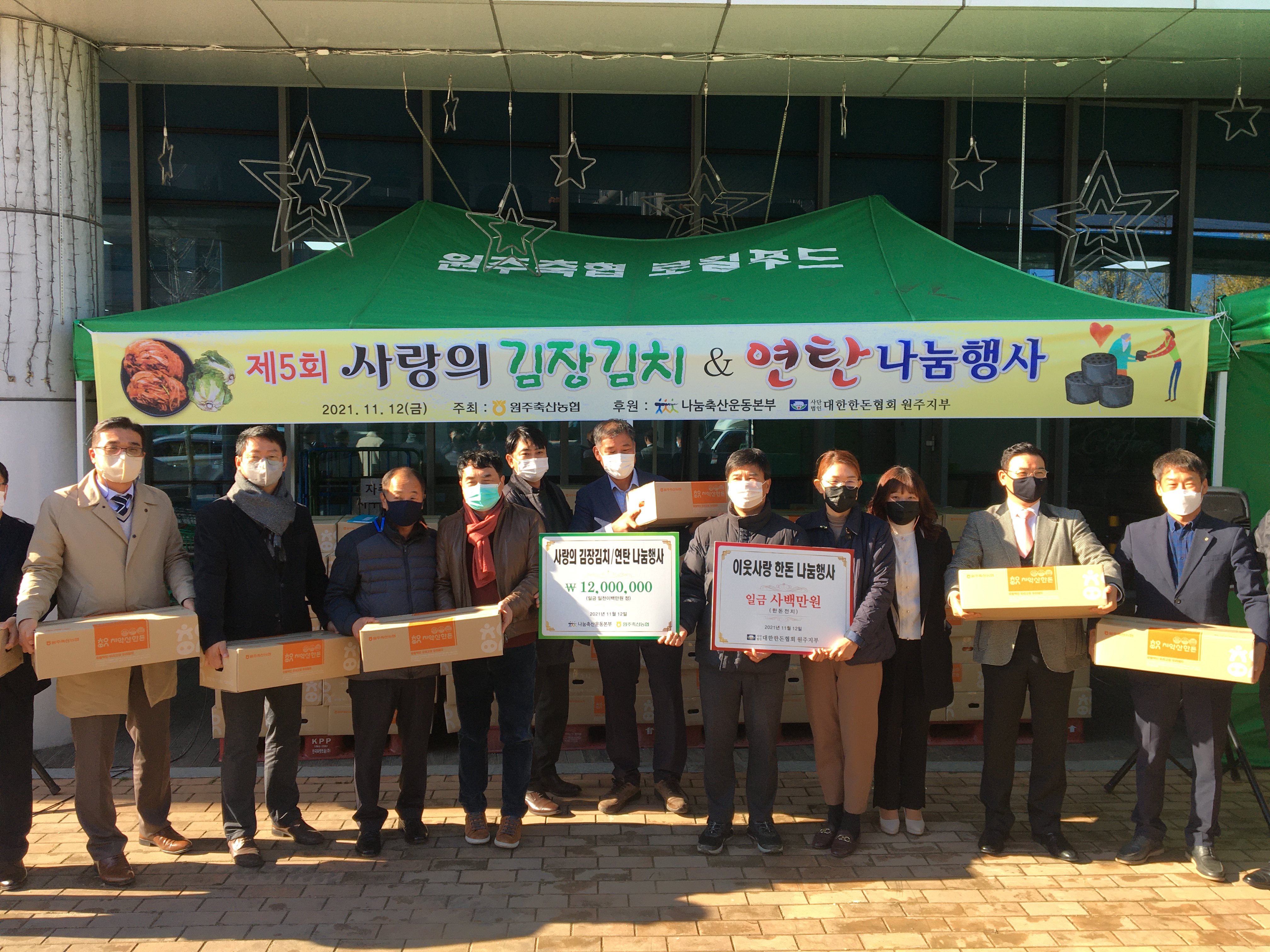[강원사회복지신문 홍기한 기자]=원주축산업협동조합 봉사단체와 대한한돈협회 원주시지부는 지난 11월 12일 사랑의 김장김치·연탄 나눔 행사를 열고 지역 독거노인 등 소외계층 170명과 사회복지시설 3곳에 김장김치 250상자(1,200만 원 상당), 어려운 이웃 8가구에 연탄 2,400장을 전달했다. 이날 행사에서는 대한한돈협회...