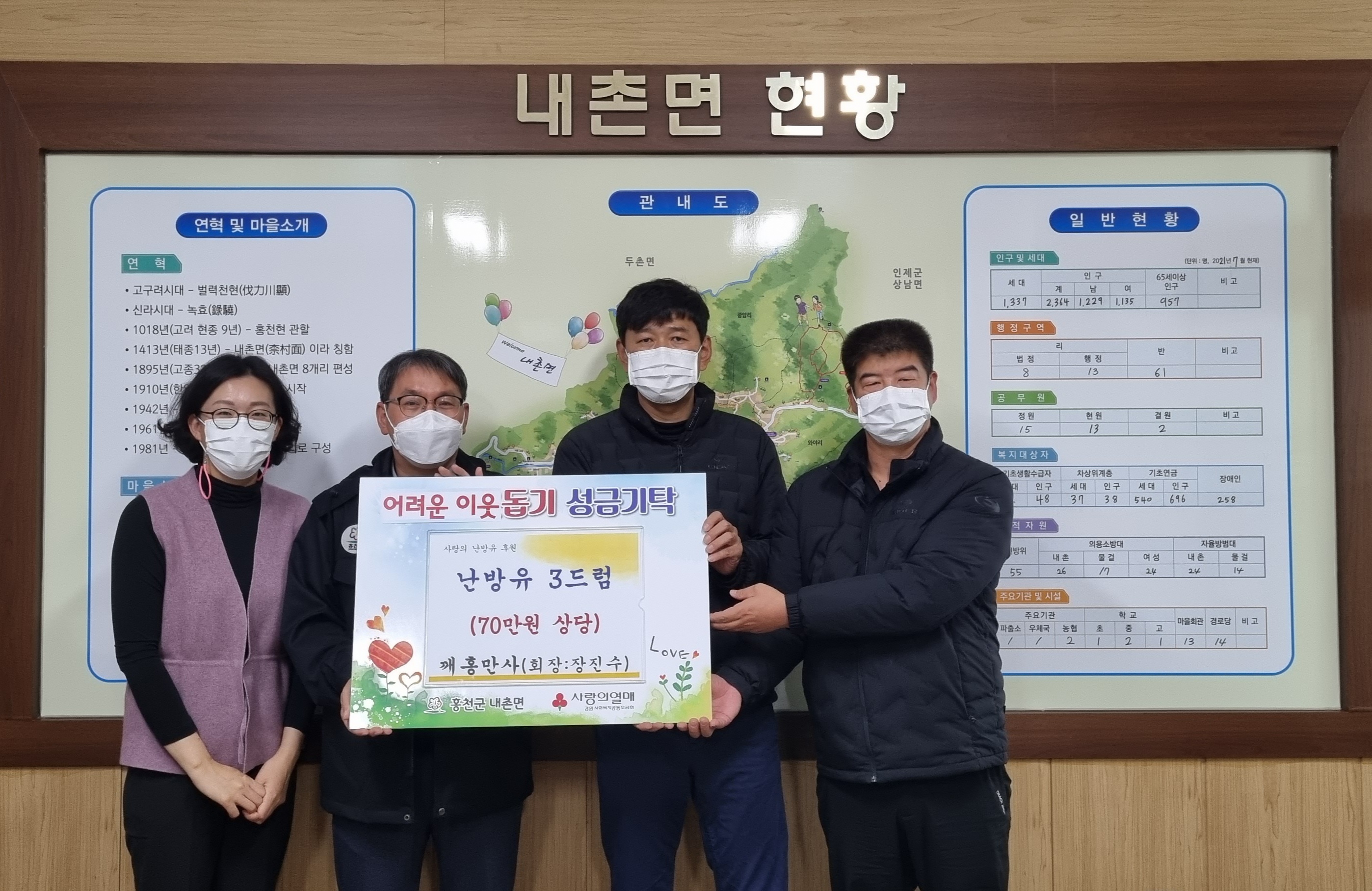 [강원사회복지신문 서은진 기자]=홍천군 소속 환경미화원 모임 '깨홍만사(깨끗한 홍천을 만드는 사람들·회장 장진수)'는 지난 11월 11일 내촌면에 70만원 상당의 난방유 3드럼을 후원했다. 난방유는 내촌면에 거주하는 장애인과 홀몸 어르신 등 저소득 3가구에 1드럼씩 제공할 예정이다. 장진수 회장은 "올해는 유독 추위가...