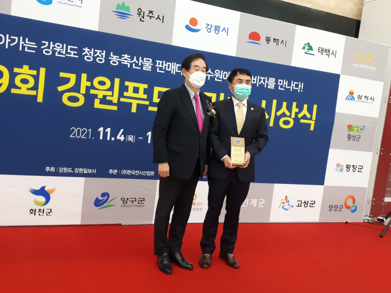 [강원사회복지신문 홍기한 기자]=원주시가 강원도의 우수 농특산물을 홍보하기 위해 지난 11월 4일부터 7일까지 수원컨벤션센터에서 열린 2021년 제9회 강원푸드 박람회에서 지역 상품의 우수성과 농가 판로 개척에 기여한 공로를 인정받아 최우수상을 수상했다.