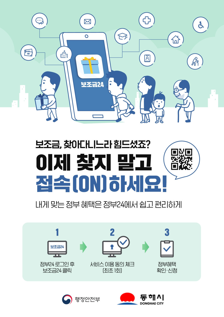[강원사회복지신문 김종한 기자]=내가 받을 수 있는 보조금(혜택)이 궁금하시다면? 동해시(시장 심규언)는 국가보조금 맞춤형 서비스인 '보조금24'의 지자체 서비스가 확대되는 올 연말에 맞춰 활발한 홍보활동을 펼치고 있다. '보조금24'는 동 주민센터를 직접 방문하거나, 여러 웹사이트를 방문하지 않고도 정부24를 통해 ...
