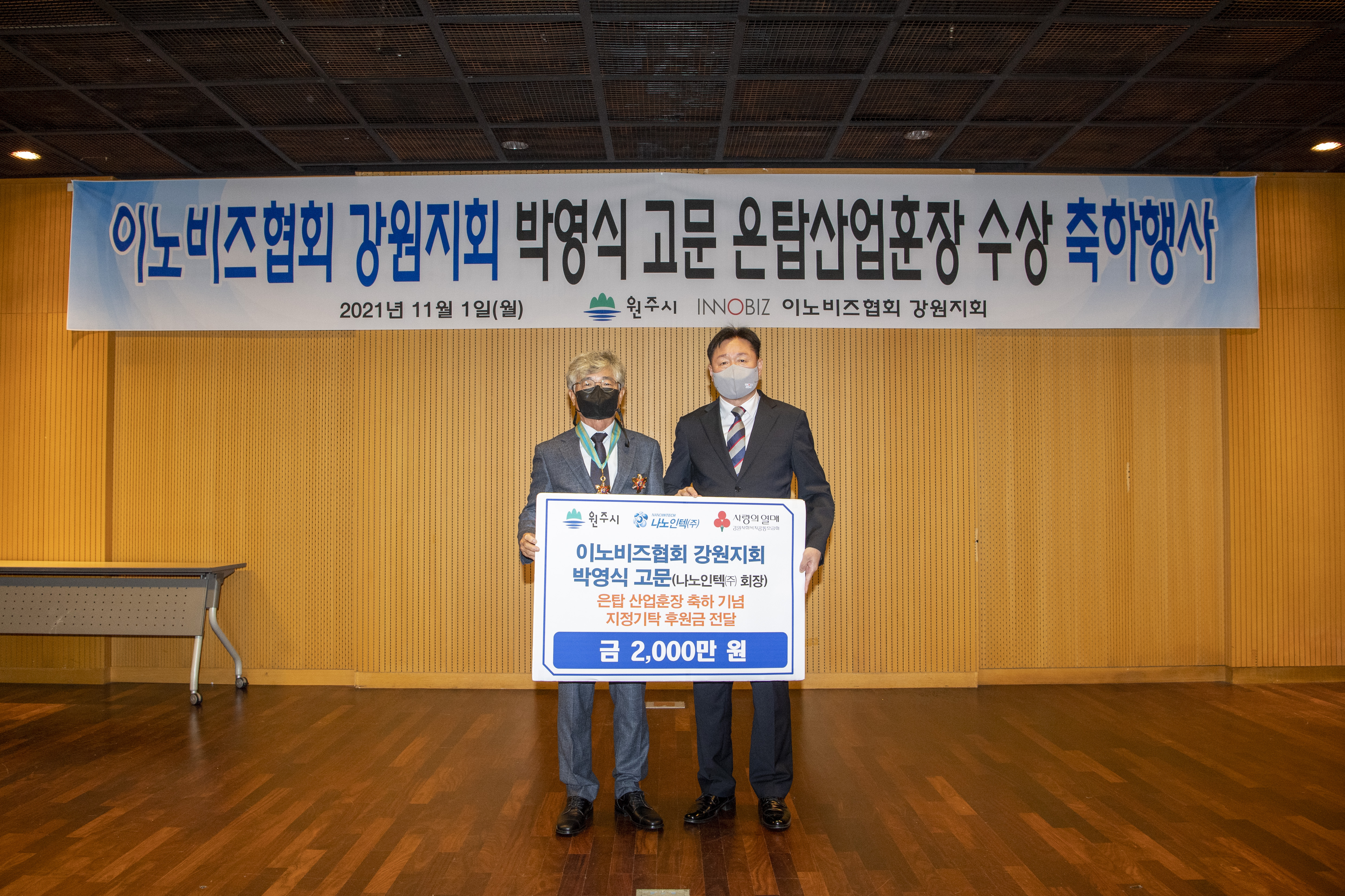 [강원사회복지신문 홍기한 기자]=이노비즈협회 강원지회 박영식 고문[나노인텍(주) 대표]은 지난 11월 1일 센츄리21CC 세미나실에서 개최된 2021년 제22회 중소기업기술혁신대전 수상기업 축하행사에서 후원금 2,000만 원을 원주시에 전달했다. 후원금은 사회복지공동모금회를 통해 원주시 사회복지시설 및 저소득가구에 전해...