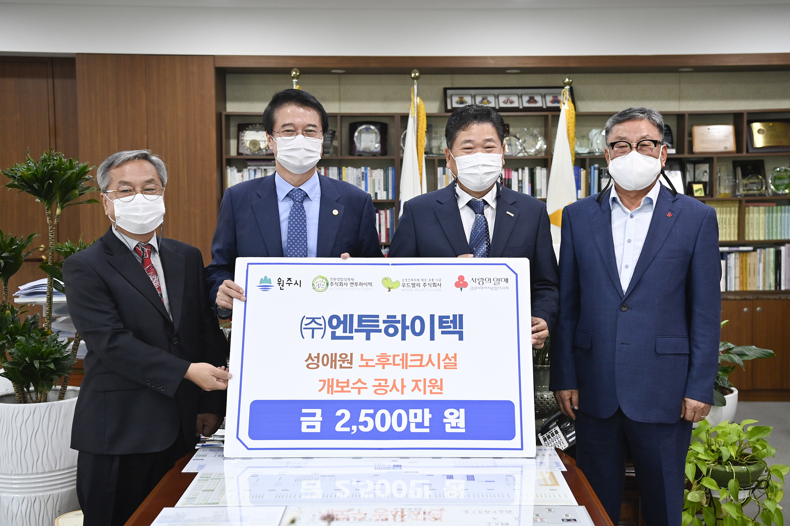 [강원사회복지신문 서은진 기자]=(주)엔투하이텍(대표 김재성)은 지난 10월 12일 원주시장 집무실을 방문해 사회복지시설 성애원의 노후 데크시설 개보수 공사비에 사용해 달라며 원창묵 원주시장에게 2,500만 원을 전달했다.