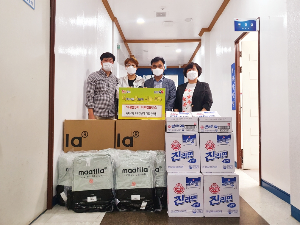 [강원사회복지신문 김종한 기자]=라면 25박스 및 이불 25채 기탁 동해 리버스배드민턴센터(대표 안태웅)에서 지난 10월 6일 천곡동 행정복지센터(동장 김세환)를 방문해 천곡동 저소득층 이웃들을 위해 사용해 달라며, 라면(20입) 25박스와 이불 25채를 기탁했다. 2020년 9월 동해시 평릉동에 리버스 배드민턴센터를 개장해 ...
