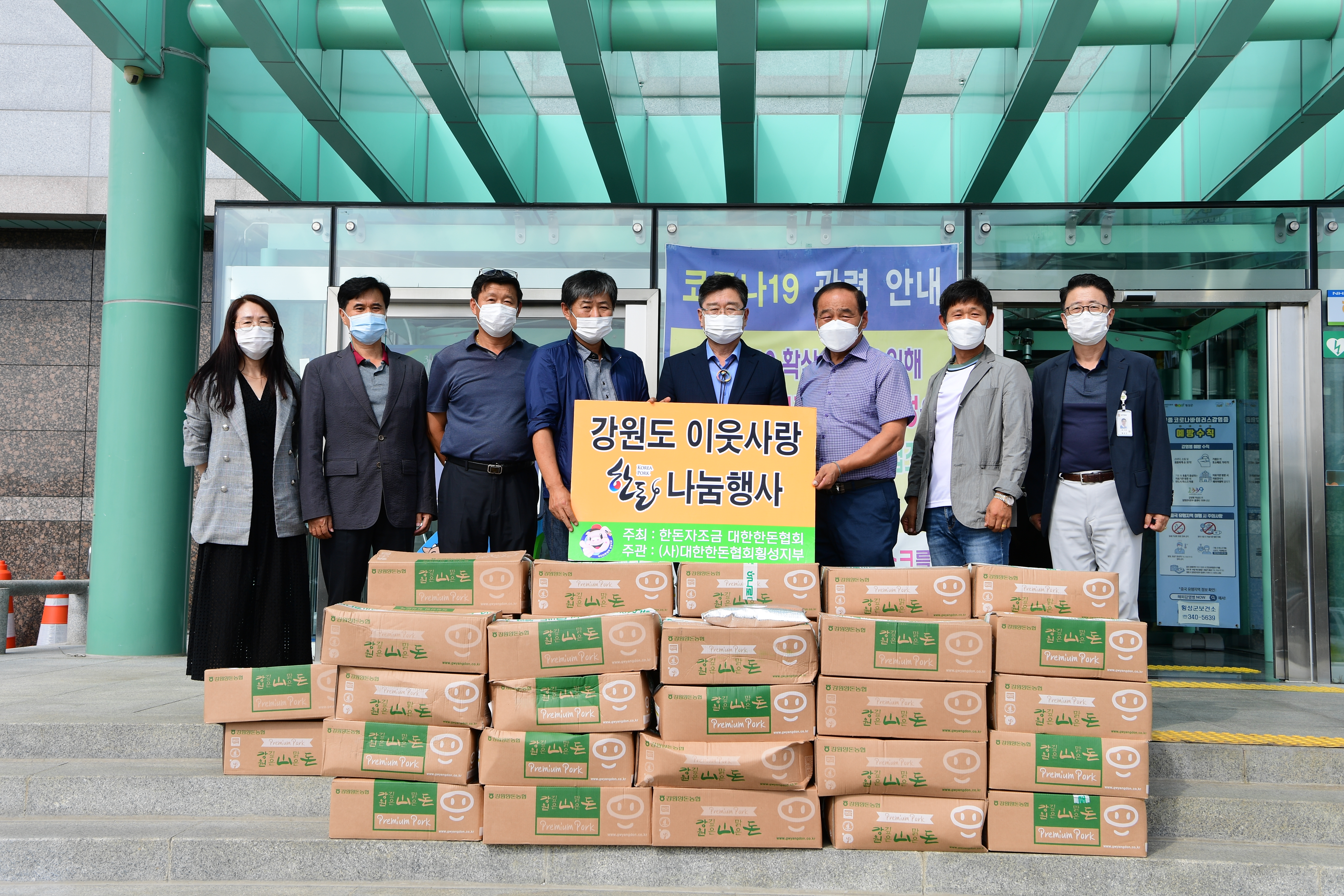 [강원사회복지신문 홍기한 기자]=대한한돈협회 횡성군지부(지부장 김용구)는 지난 10월 5일 횡성군청을 방문하여 돼지고기 500kg(4,500천원 상당)을 '횡성행복나눔성금'에 기탁했다. 이날 전달식에는 장신상 횡성군수와 함께 대한한돈협회 횡성군지부 지부장 김용구 외 4명이 참석하였다. 기탁받은 돼지고기는 각 읍·면 저소...