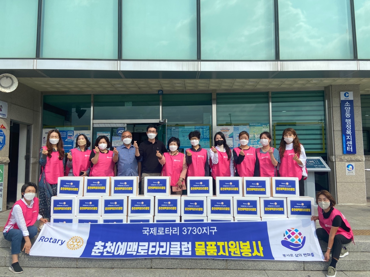 [강원사회복지신문 이정환 기자]=춘천예맥로타리클럽(회장:최정순)은 지난 10월 5일 춘천시 소양동행정복지센터를 방문해 후원물품(닭갈비꾸러미)을 전달했다.