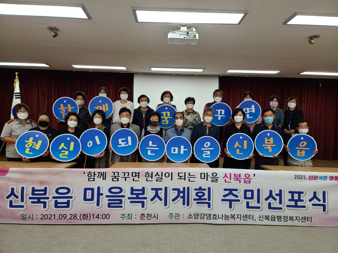 [강원사회복지신문 홍기한 기자]=춘천시 신북읍 행정복지센터(읍장:김영배)와 소양강댐효나눔복지센터(센터장:허미숙)는 지난 9월 28일 춘천시 신북읍 행정복지센터에서 '신북읍 마을복지계획단 주민선포식'을 개최했다.