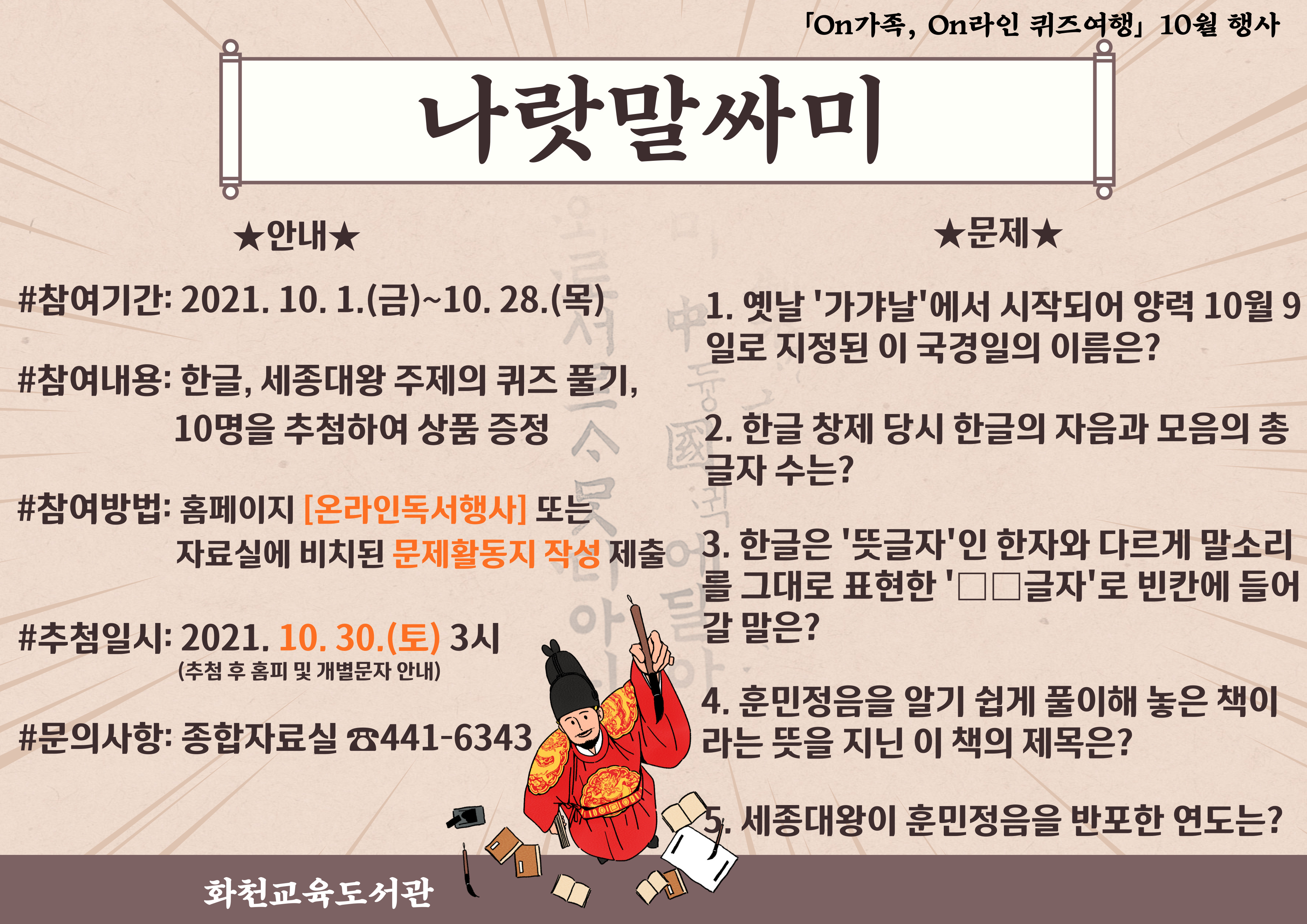 [강원사회복지신문 유경수 기자]=화천교육도서관(관장 최복진)은 오는 10월 도서관 특색사업 'On 가족, On 라인 퀴즈여행'의 일환으로 <나랏말싸미>를 운영할 예정이다. 'On 가족, On 라인 퀴즈여행'은 도서관 홈페이지 또는 자료실 내에서 누구나 손쉽게 참여할 수 있는 온/오프라인 행사로 10월 9일 한글날을 맞이하...