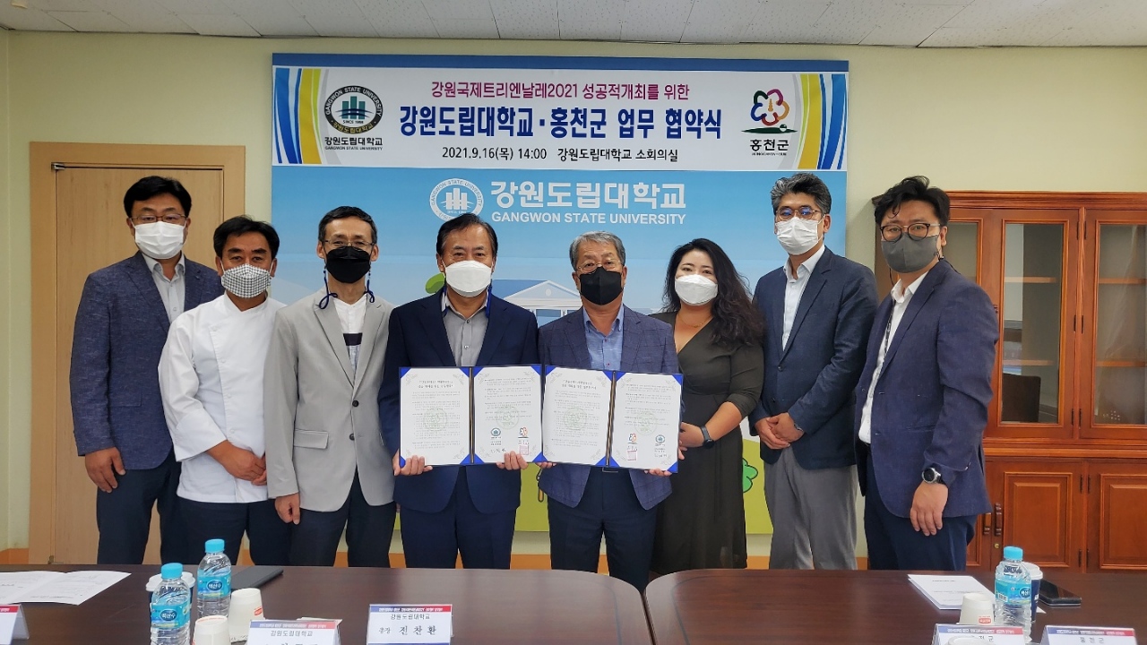 [강원사회복지신문 이정환 기자]=바리스타제과제빵과, 홍천의 특산품을 이용한 젤라또 개발 및 행사장 커피·젤라또 판매 지원 등 강원도립대학교(총장 전찬환)는 성공적인 강원국제트리엔날레 2021 행사운영 지원을 위해 지난 9월 16일(목) 홍천군과 업무협약에 나섰다. 강원국제트리엔날레2021은 2018평창동계올림픽 레거시...