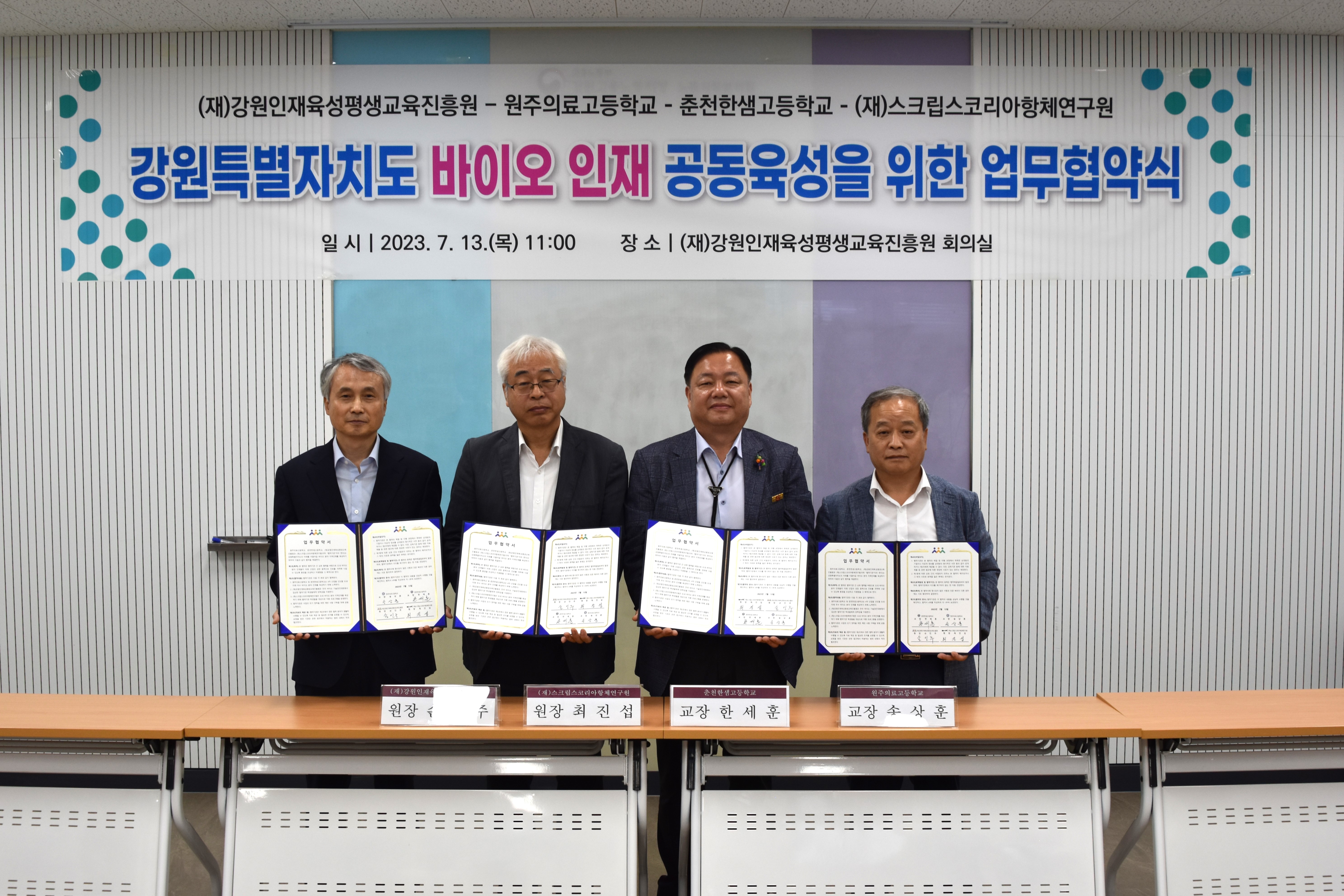 [강원사회복지신문 이정환 기자]=(재)강원인재육성평생교육진흥원-원주의료고등학교-춘천한샘고등학교-(재)스크립스코리아항체연구원 바이오 인재 육성 업무협약 체결 (재)강원인재육성평생교육진흥원(원장 손인주)은 지난 7월 13일(목) 재단 회의실에서 원주의료고등학교, 춘천한샘고등학교, (재)스크립스코리아항체연구원과...