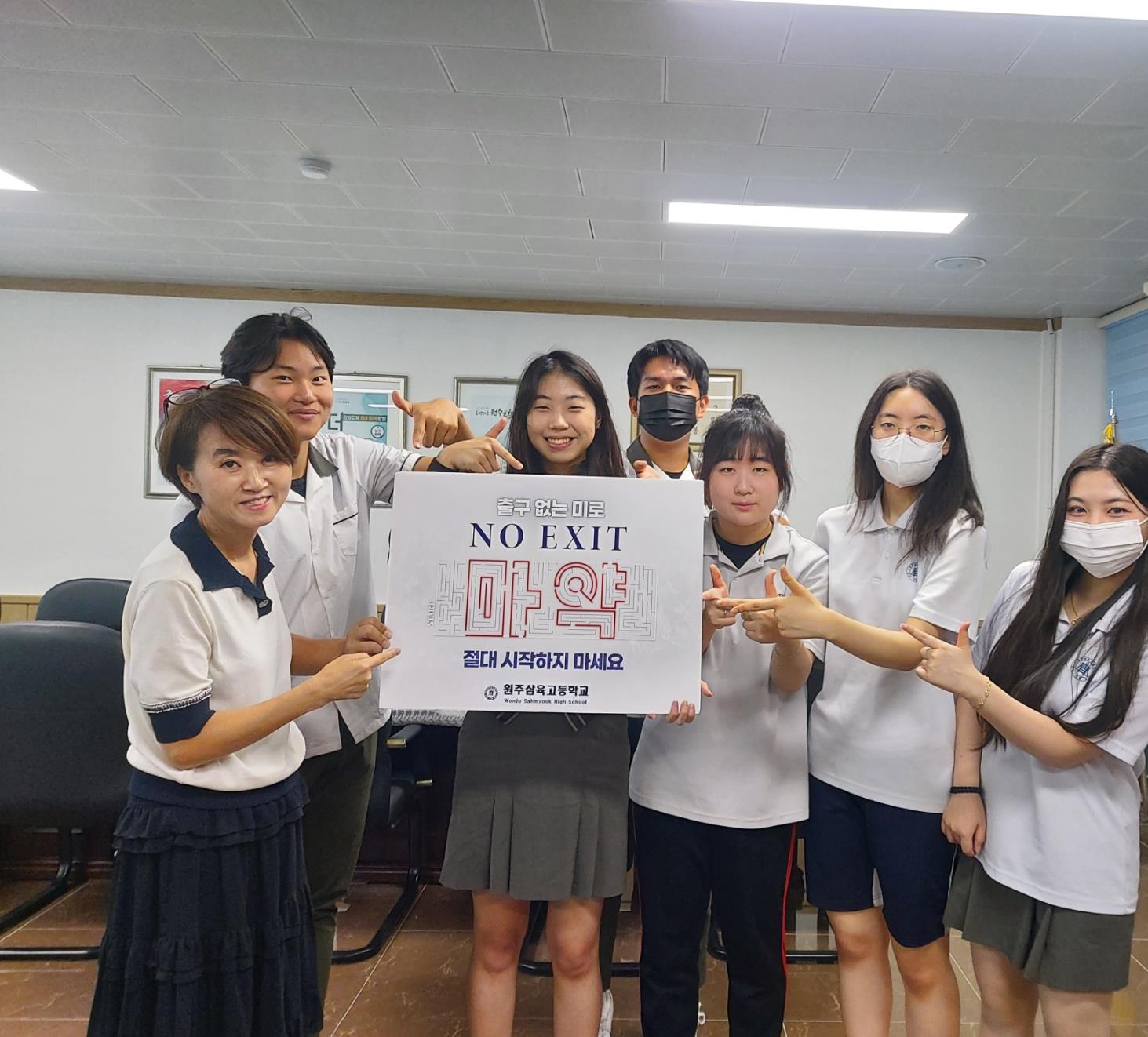 [강원사회복지신문 김도연 기자]=원주삼육중고등학교(교장 김인숙)는 지난 7월 13일(목) 학생자치실에서 마약범죄 예방을 위한 'NO EXIT' 릴레이 캠페인에 동참했다. 'NO EXIT' 캠페인은 마약중독의 위험성을 환기하고 경각심을 고취하여 마약범죄를 예방하고자 하는 캠페인으로, 경찰청 및 마약퇴치운동본부와 관계부처 합동...