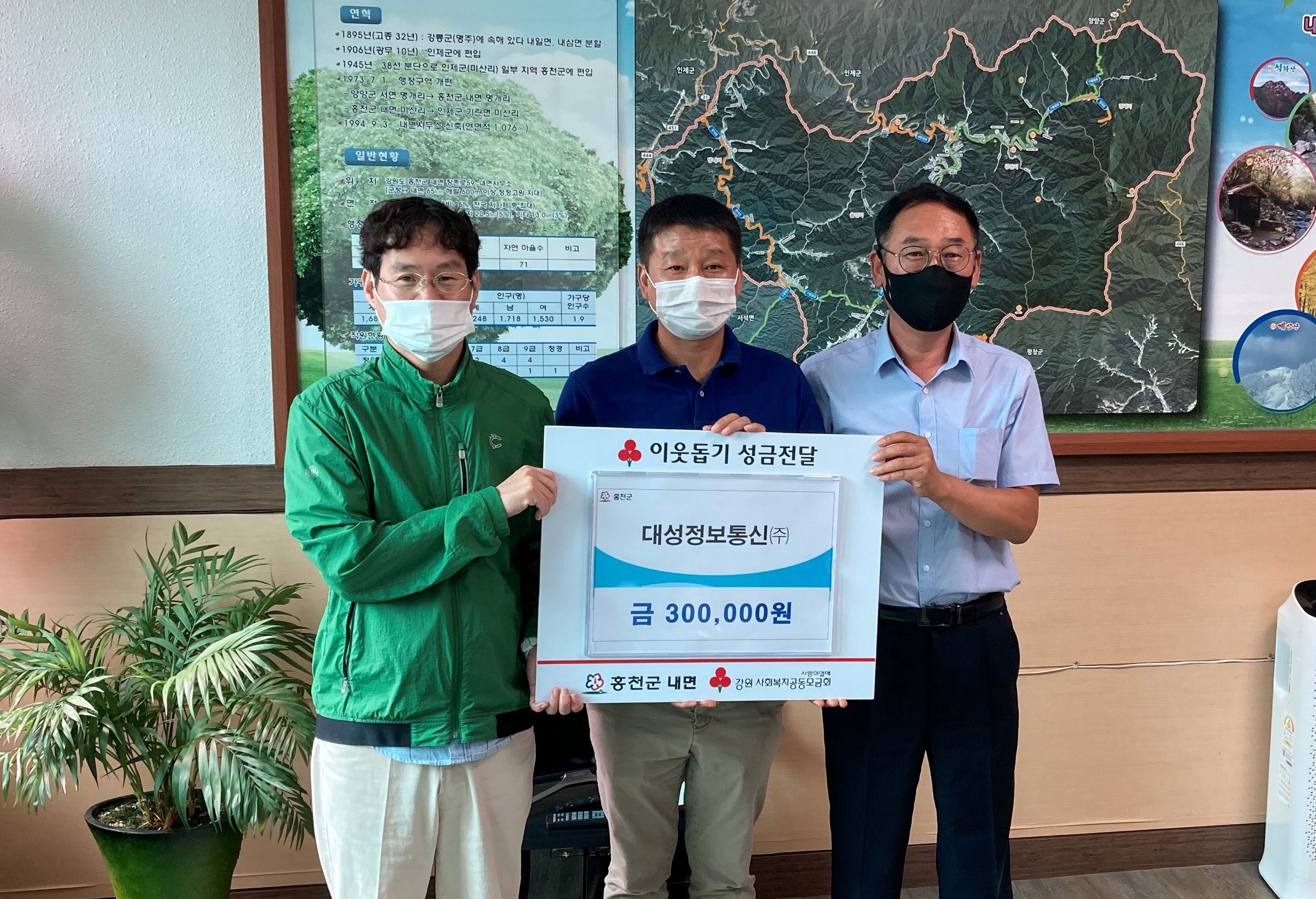 [강원사회복지신문 서은진 기자]=(주)대성정보통신(대표 안희순)은 지난 8월 30일 홍천군내면 행정복지센터를 방문, 어려운 이웃을 위해 사용해 달라며 성금 30만원을 전달했다. 안희순 대표는 "작은 도움이나마 어려운 이웃들을 위해 쓰이길 바란다"고 말했다. 권도혁 내면장은 "후원에 감사드린다”며 “전달하신 성금은 어...