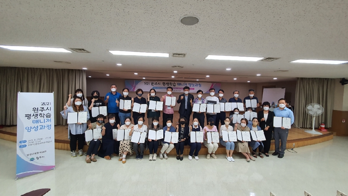 [강원사회복지신문 유경수 기자]=평생학습센터 배치 예정 '2021년 원주시 평생학습 매니저 양성과정' 수료식이 지난 8월 27일 원주시 평생교육원 학습관에서 열렸다. 이날 수료식에서는 8월 23일부터 27일까지 총 30시간에 걸친 과정을 모두 마친 28명의 수강생에게 수료증이 전달됐다. 원주지역 내 인적자원을 발굴하고자 마...