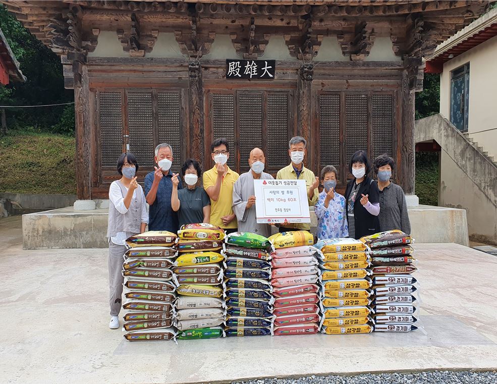 [강원사회복지신문 김종한 기자]=동해시 만우동에 소재한 사찰 정심사 신도회에서는 지난 8월 30일 우리민족의 고유명절인 추석을 맞이해 관내 어려운 이웃에게 전해 달라며 '사랑의 쌀' 60포(250만원 상당)를 망상동행정복지센터에 기탁했다. 기탁받은 백미는 추석 명절 전까지 생계가 어려운 복지대상자 60가구에게 전달될...