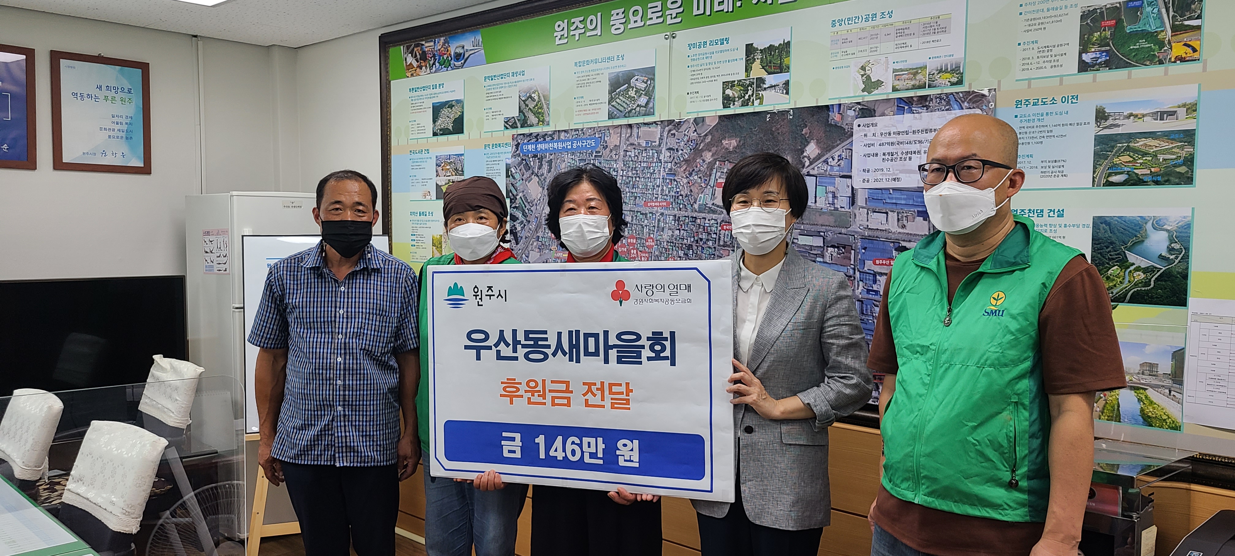 [강원사회복지신문 이정환 기자]=원주시 우산동 새마을회(지도자협의회장 김영춘·부녀회장 이현숙)는 지난 8월 10일 우산동 행정복지센터에 사랑의 열매 후원금 146만 원을 전달했다. 이번 후원금은 새마을 활력화 사업으로 진행한 '이웃사랑 휴경지 경작'을 통해 재배한 감자 판매 수익금으로 마련했다.