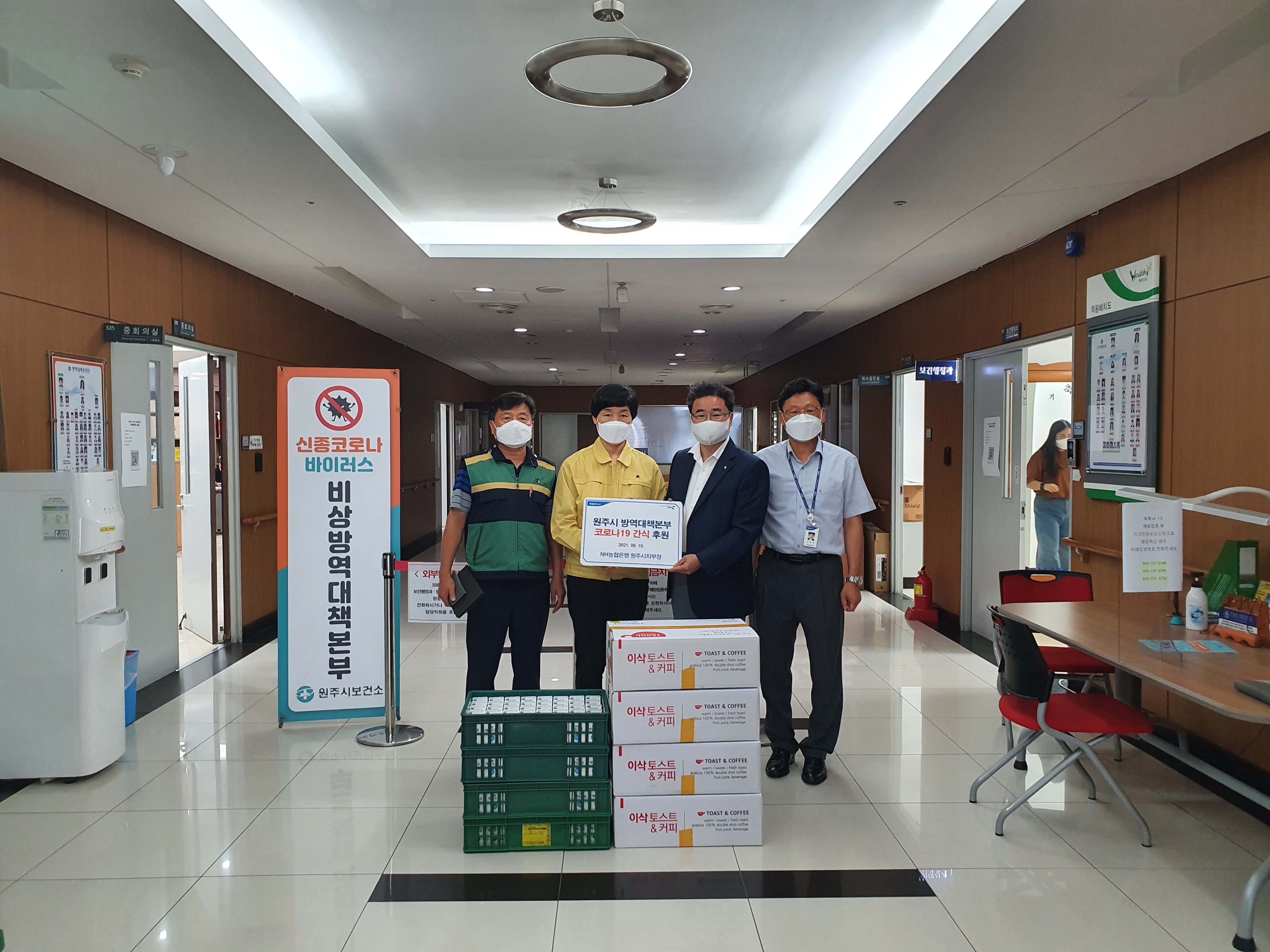 [강원사회복지신문 유경수 기자]=NH농협은행 원주시지부(지부장 이광연)는 코로나19 방역 활동에 힘쓰고 있는 직원들에게 감사의 마음을 전하기 위해 지난 8월 10일 원주시 방역대책본부를 방문해 토스트와 우유 각 150개를 전달했다.