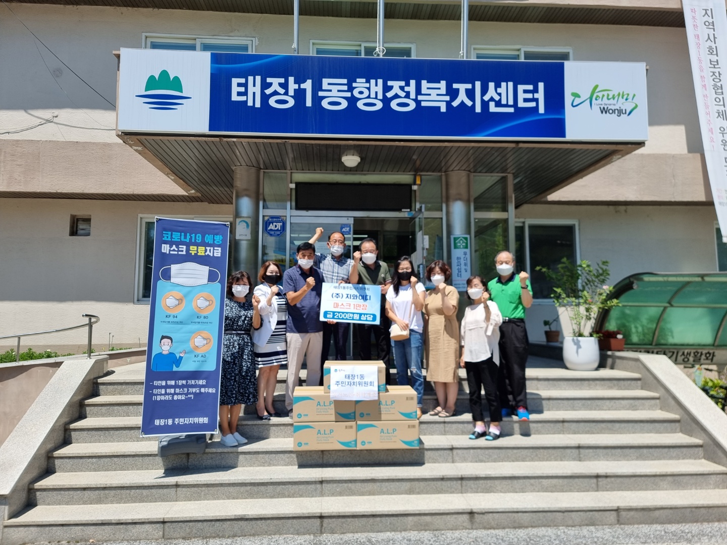 [강원사회복지신문 서은진 기자]=경기도 안산시 소재 마스크·체온계 전문업체 (주)지와이디(회장 이원직)와 원주시 태장1동 주민자치위원회(회장 고영식)는 지난 7월 23일 지역 독거노인 등 취약계층을 위해 원주시 태장1동 행정복지센터(동장 임성진)에 200만 원 상당의 코로나19 예방 마스크 1만 장을 전달했다.