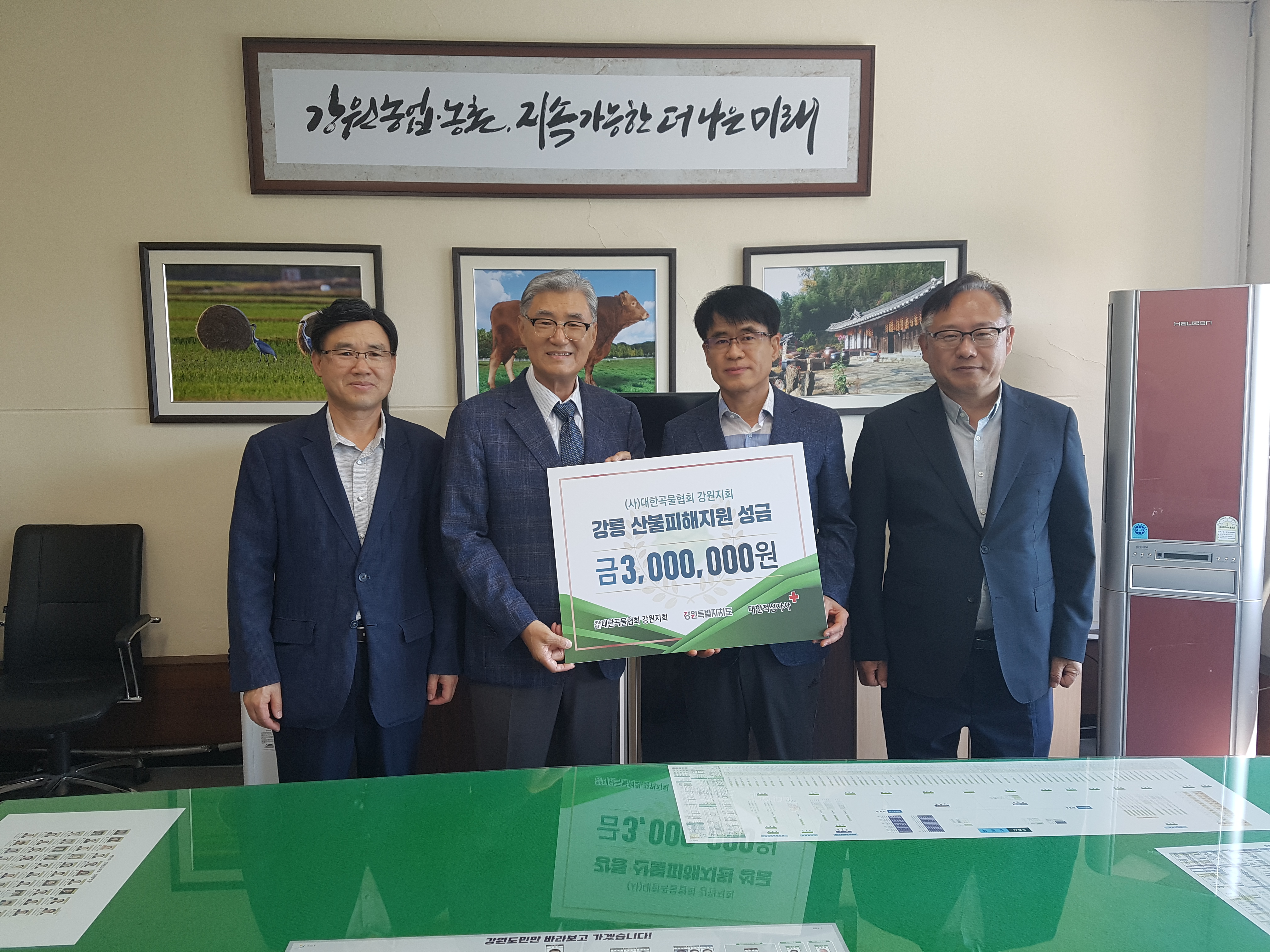 [강원사회복지신문 서은진 기자]=대한곡물협회 강원지회(회원 61명)에서는 지난 6월 14일(수), 14:00 강원특별자치도청 농정국장실에서 강릉산불 피해 지원을 위한 성금 3백만원을 대한적십자사 강원지회에 전달했다.