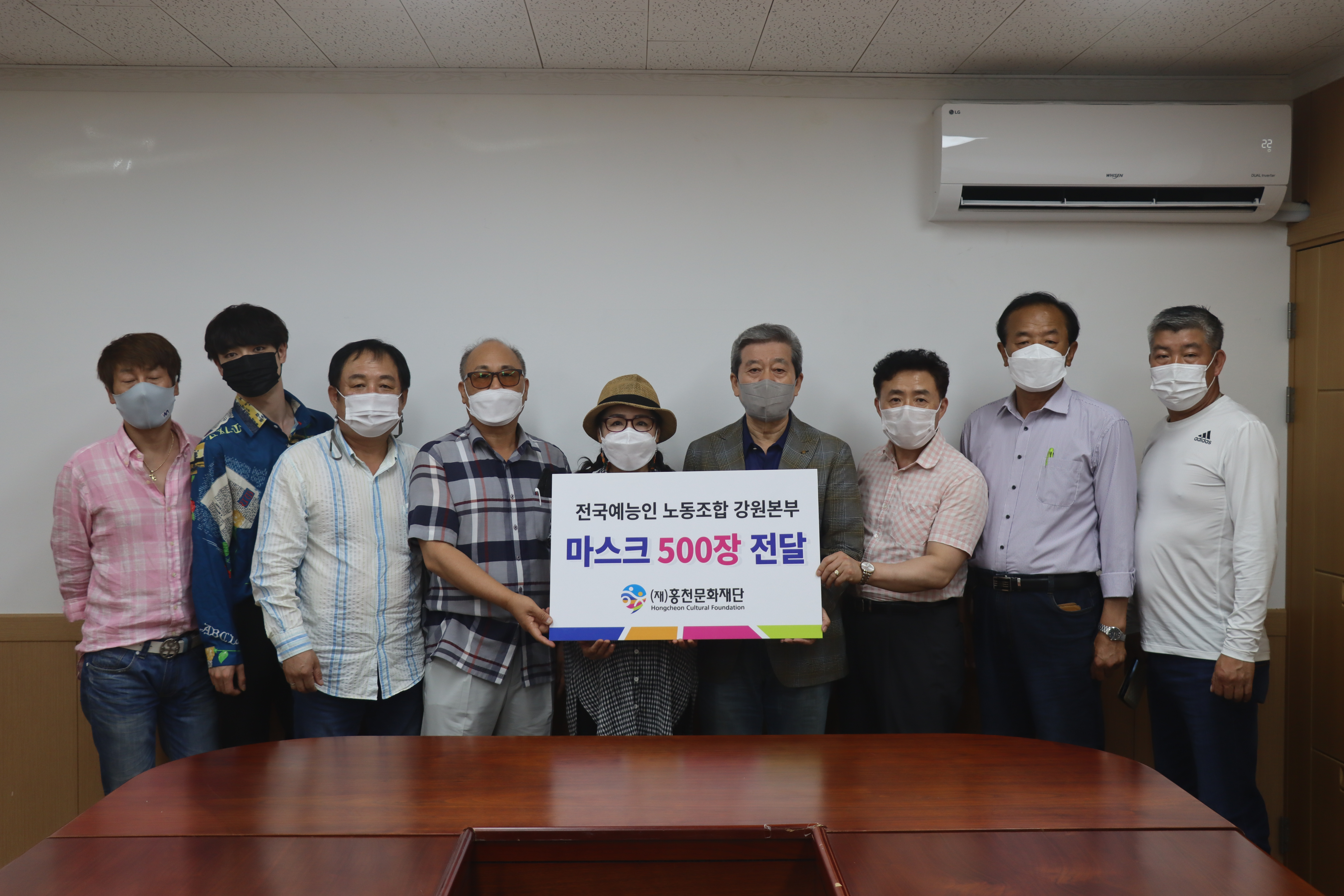 [강원사회복지신문 홍기한 기자]=전국예능인 노동조합 강원본부 최현수 본부장과 회원은 지난 7월 13일(화) 홍천문화재단을 방문하여 재단에서 추진하는 공연과 행사 등에서 코로나19 안전 확보를 위한 비상용 마스크로 활용할 수 있도록 전명준 대표이사에게 방역 마스크 500장을 전달하였다.