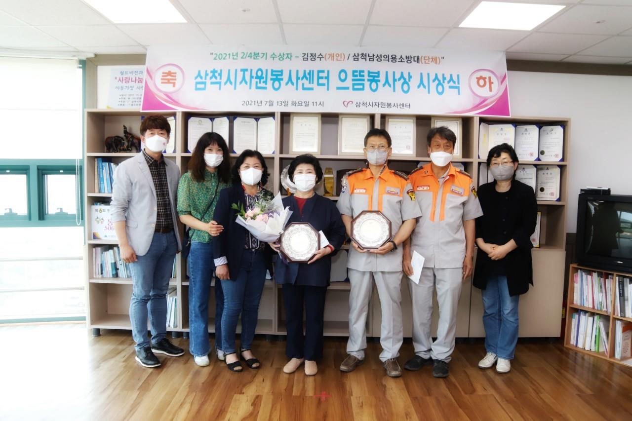 [강원사회복지신문 김종한 기자]=삼척시자원봉사센터(센터장 정영옥)는 지난 7월 13일 오전11시, 나눔과 봉사를 모범적으로 실천한 봉사자와 봉사단체에 대한 으뜸봉사상 시상식을 가졌다. 이날 개인부문에는 취약계층을 위한 물품전달과 클린강원 활동으로 코로나19 방역에 힘쓴 김정수 자원봉사자가, 단체부문에는 노인안전...