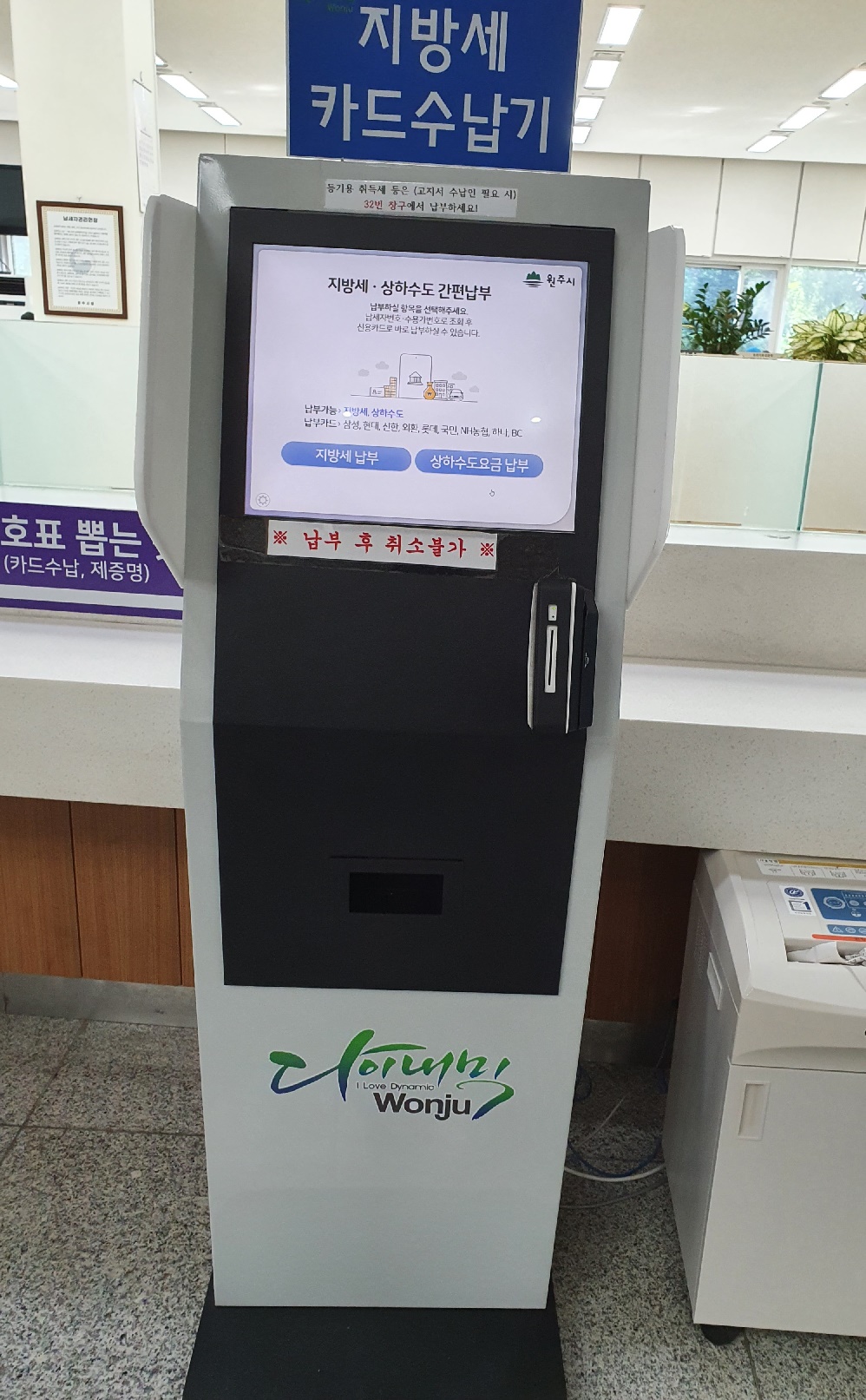 [강원사회복지신문 서은진 기자]=원주시청 청사 1층 징수과 앞 지방세 무인수납기에 기능 추가 수용가 번호 입력 후 신용카드 이용 간단 납부, 시민 편의 기대 원주시 상하수도사업소는 시민 편의를 위해 시청 청사 1층 징수과 앞에 설치된 지방세 무인수납기에 상하수도요금 납부 기능을 추가했다고 밝혔다. 직원 대면 없이...