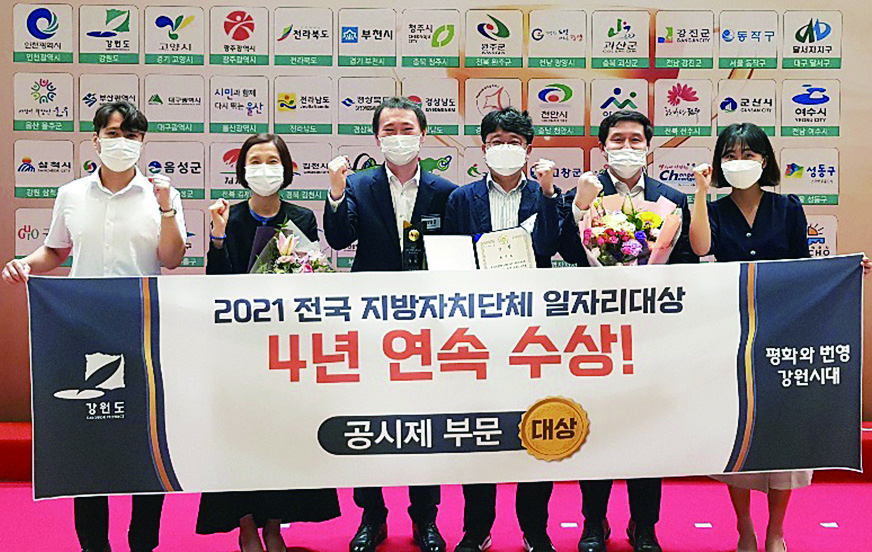 [강원사회복지신문 홍기한 기자]=강원도 역대 최고 성적 달성, 4개년 연속 수상 강원도(도지사 최문순)가 2021년 전국 지방자치단체 일자리대상을 수상하는 영예를 안았다. 강원도는 고용노동부(장관 안경덕) 주관으로 지난 7월 6일 대전 호텔ICC에서 열린 '2021 전국 지방자치단체 일자리대상'에서 대상을 수상하였으며, 내...