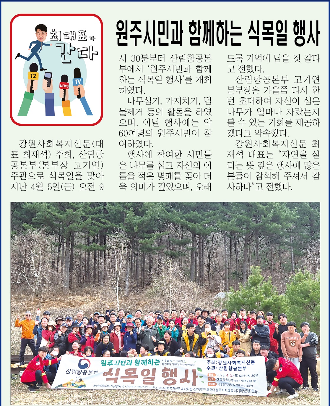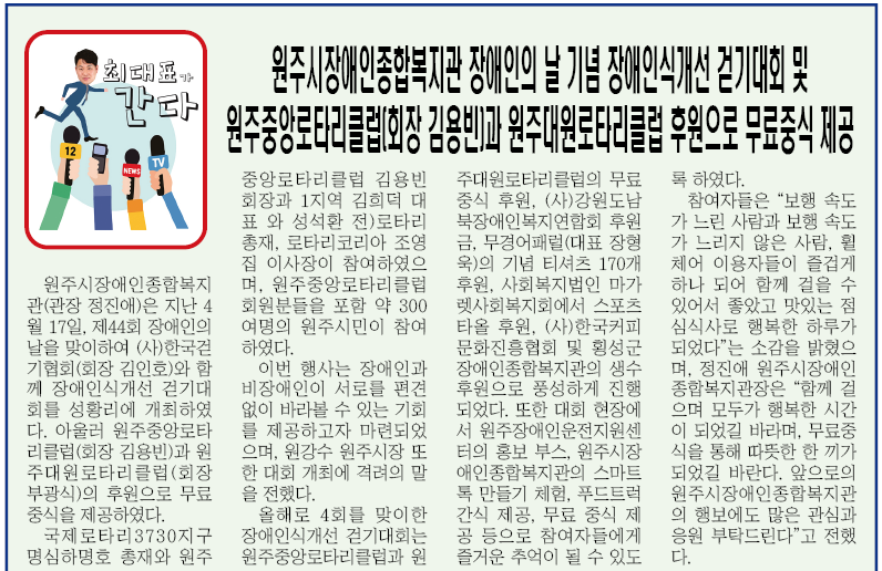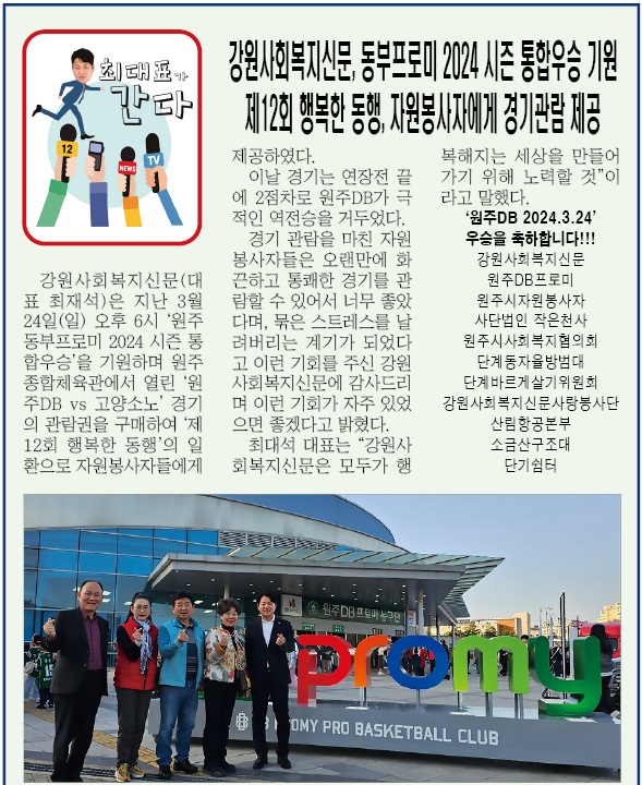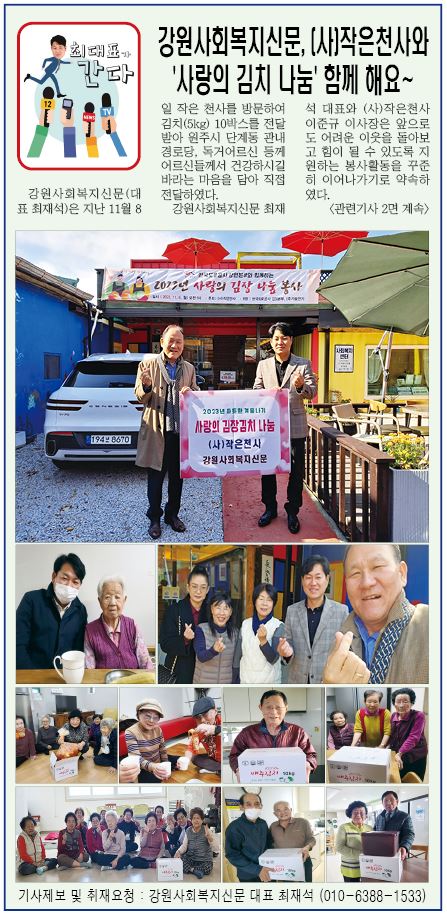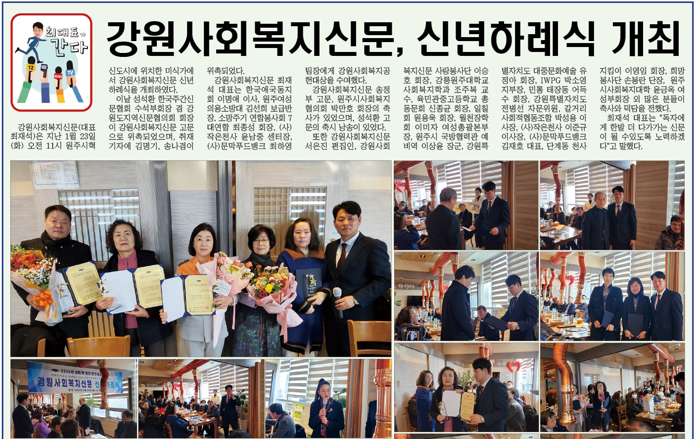강원사회복지신문 주최, 작은천사 주관으로 지난 2월 5일 오전 10부터 작은천사 빨간고래 카페 앞 마당에서 '2024년 설 맞이 떡국 나눔' 행사가 개최되었다. 작은천사 이준규 이사장은 "아프리카의 넬슨만델라 대통령께서 주창하신 "네가 있기에 내가 있고 내가 있기에 네가 있고 우리가 있다"는 우분투 정신을 기본으로 하여...