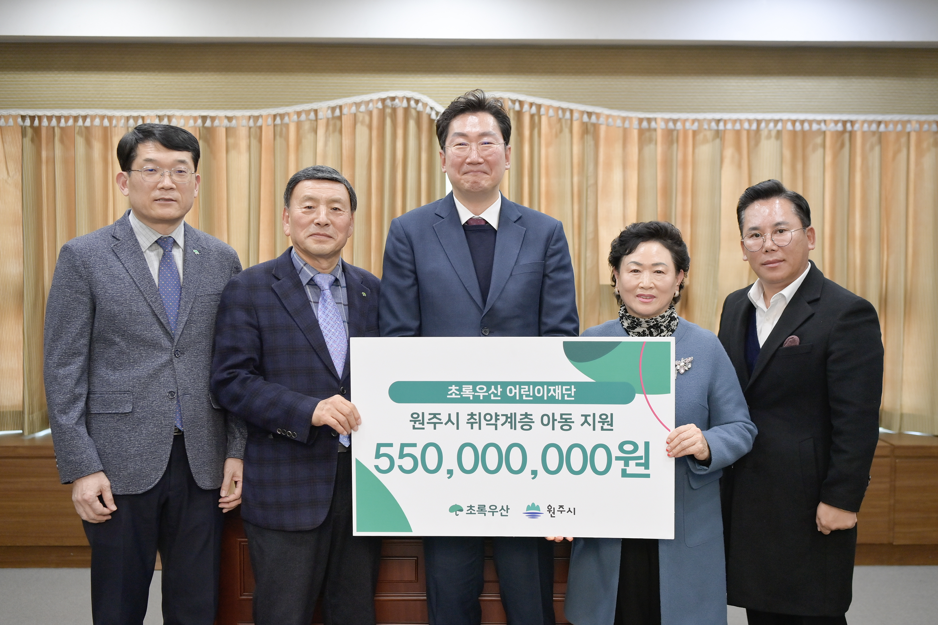 초록우산 어린이재단 강원후원회(후원회장 황인구)와 초록우산 강원지역본부(본부장 정동환)는 지난 3월 14일 원주시청 7층 투자상담실에서 후원금 5억 5천만 원을 전달했다. 초록우산 어린이재단 강원지역본부는 1981년 불우이웃 결연사업을 보건복지부로부터 위탁받아 사업을 수행하고 있다. 이번 후원금 5억 5천만 원은 가...