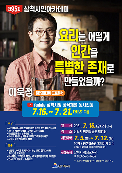 [강원사회복지신문 김종한 기자]=이욱정 KBS미디어프로듀서 "요리는 어떻게 인간을 특별한 존재로 만들었을까?" 삼척시는 오는 7월 16일(금) 오후 3시, 평생학습관 대강당에서 제95회 삼척시민아카데미를 대면과 온라인 강연(삼척시청 공식 유튜브 채널)을 동시에 개최한다. 이번 시민아카데미는 이욱정 KBS미디어프로듀서를...
