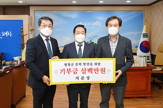 [강원사회복지신문 이정환 기자]=인천시 오류동 검단일반산업단지에 위치하여 실린더, 쿨러, 엘리베이터부품 등의 납품사업을 하고 있는 UCC엔지니어링(대표 지준상)은 지난 6월 30일 오전 9시 30분 평창군 문학발전을 위하여 평창군수 집무실에서 후원금 3백만원을 문화관광과에 기탁했다.