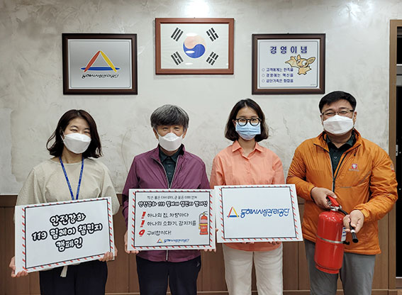 [강원사회복지신문 김종한 기자]=동해시시설관리공단(이사장 장덕일)은 지난 6월 17일 각 가정 내 소방시설설치를 독려하는 '안전강화 119 릴레이 챌린지 캠페인'에 동참했다. '안전강화 119 릴레이 챌린지 캠페인'은 제58회 소방의 날(2020.11.09)을 맞이하여 인천광역시와 인천소방본부에서 국민들의 화재예방과 주택용 소...