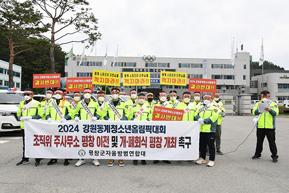 [강원사회복지신문 이정환 기자]=평창군자율방범연합대(대장 신승국)는 지난 6월 17일 평창군청 앞에서 2024강원동계청소년올림픽대회 조직위 주사무소 평창 이전과 개폐회식장 평창 개최를 촉구하는 성명서를 발표했다.