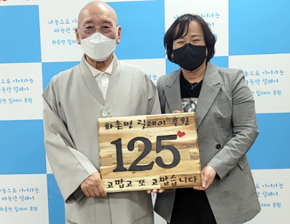 11번의 릴레이 기부, 지역사회에 선한 영향력 발휘 [강원사회복지신문 홍기한 기자]=홍천군 화촌면 광운사 청운 회주스님은 지난 6월 7일 화촌면 행정복지센터를 방문, 자비와 나눔의 삶을 전하면서 '화촌면 릴레이 후원'의 125번째 주자로 참여하고 후원금을 기탁했다. 올해 3월 화촌면 릴레이 후원의 118번째 주자로 참여했...