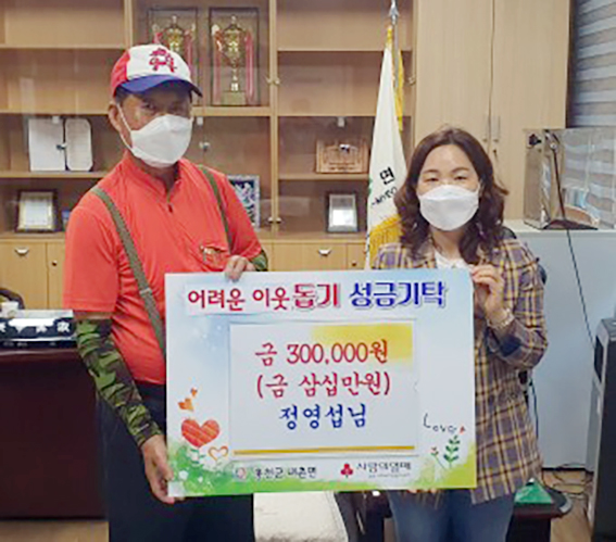 [강원사회복지신문 홍기한 기자]=홍천군 내촌면 서곡리 주민 정영섭씨는 지난 6월 4일 내촌면 행정복지센터를 방문하여 소외된 이웃을 위해 사용해달라며 성금 30만원을 전달했다. 정영섭씨는 "코로나19 장기화로 인해 더욱 힘든 시간을 보내고 있을 저소득층에게 조금이나마 도움이 되길 바란다"고 말했다. 정영섭씨는 지난...