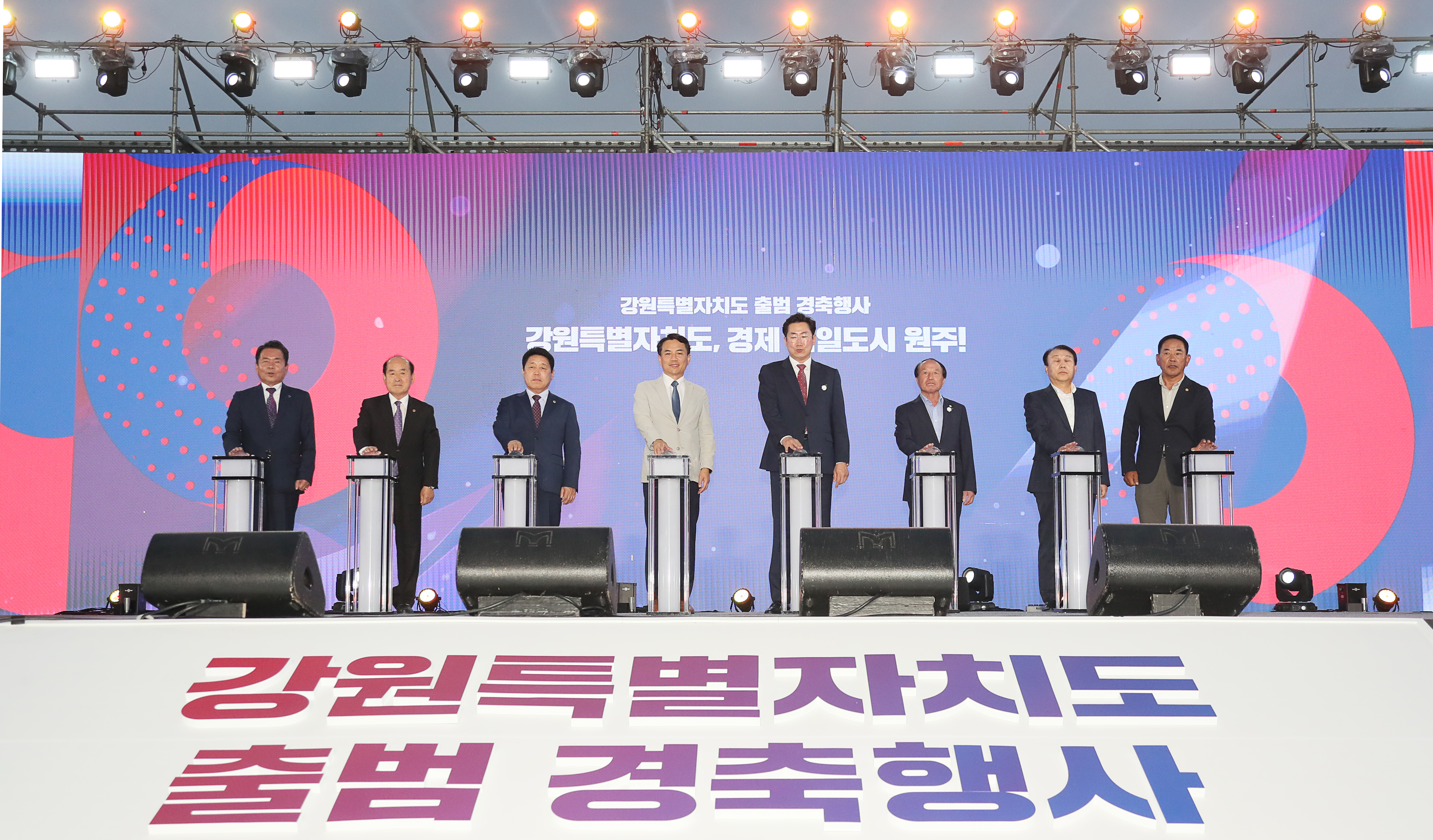 [강원사회복지신문 김도연 기자]='6월 11일 강원특별자치도 출범'을 시민과 함께 경축하고자 지난 6월 7일 저녁 6시 반, 원주 댄싱공연장(구, 따뚜공연장)에서 '강원특별자치도 출범 경축행사'가 열렸다. 이번 행사는 저녁 6시 반부터 랩터스 시범단과 아라리 응원연합의 식전 축하공연을 시작으로 기념식, 축하공연 드론쇼 ...