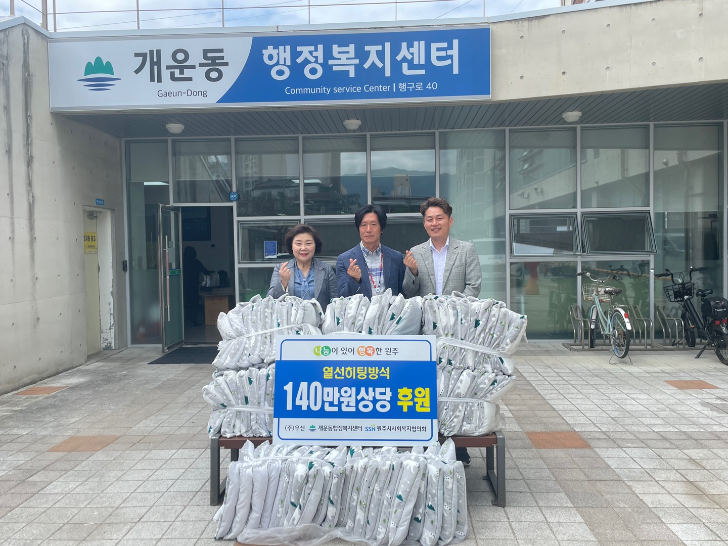 [강원사회복지신문 서은진 기자]=원주시사회복지협의회(회장 지은희)는 지난 5월 19일 원주시 개운동 행정복지센터를 방문해 140만 원 상당의 열선 방석을 후원했다. 지은희 회장은 "(주)우신에서 열선 방석을 후원받아 개운동 저소득층에 전달하게 됐다."라며, "앞으로도 지원이 필요한 곳을 대상으로 지속적인 자원 연계 활...