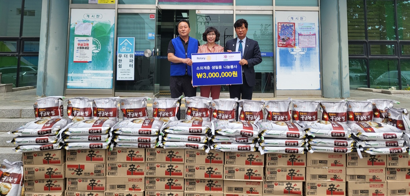 [강원사회복지신문 김도연 기자]=춘천 의암로타리클럽(회장: 심재철)과 양양현산로타리클럽(회장: 권영환)은 지난 5월 21일 춘천시 서면 지역 취약계층을 위해 300만원 상당의 쌀(40포)과 라면(40박스)을 서면행정복지센터에 전달했다.