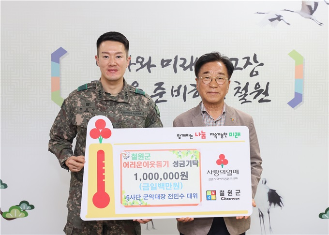 [강원사회복지신문 이정환 기자]=철원군은 최근 6사단 군악대장 전민수 대위가 철원군청 주민생활지원과를 방문하여 어려운 이웃 돕기 성금을 전달했다고 지난 5월 16일 밝혔다. 전민수 대위는 2012년 임관 이후 군 복무 기간 동안 봉사활동의 일환으로 헌혈을 시작하게 되었는데, 2023년에 헌혈 100회를 달성하게 되었고, 그...