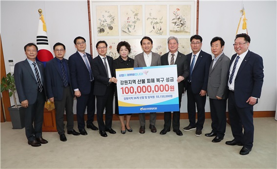 [강원사회복지신문 김종한 기자]=신협중앙회, 36개 강원지역 신협, 신협사회공헌 재단은 지난 5월 11일(목) 강원도청 통상상담실에서 강릉산불 피해 지원을 위한 성금 1억원을 전달했다. 신협중앙회 한숙자 이사, 신협 강원지역협의회 이도식 회장 등은 "산불로 피해를 입은 주민들의 어려움 극복과 일상회복에 조금이나마 도...